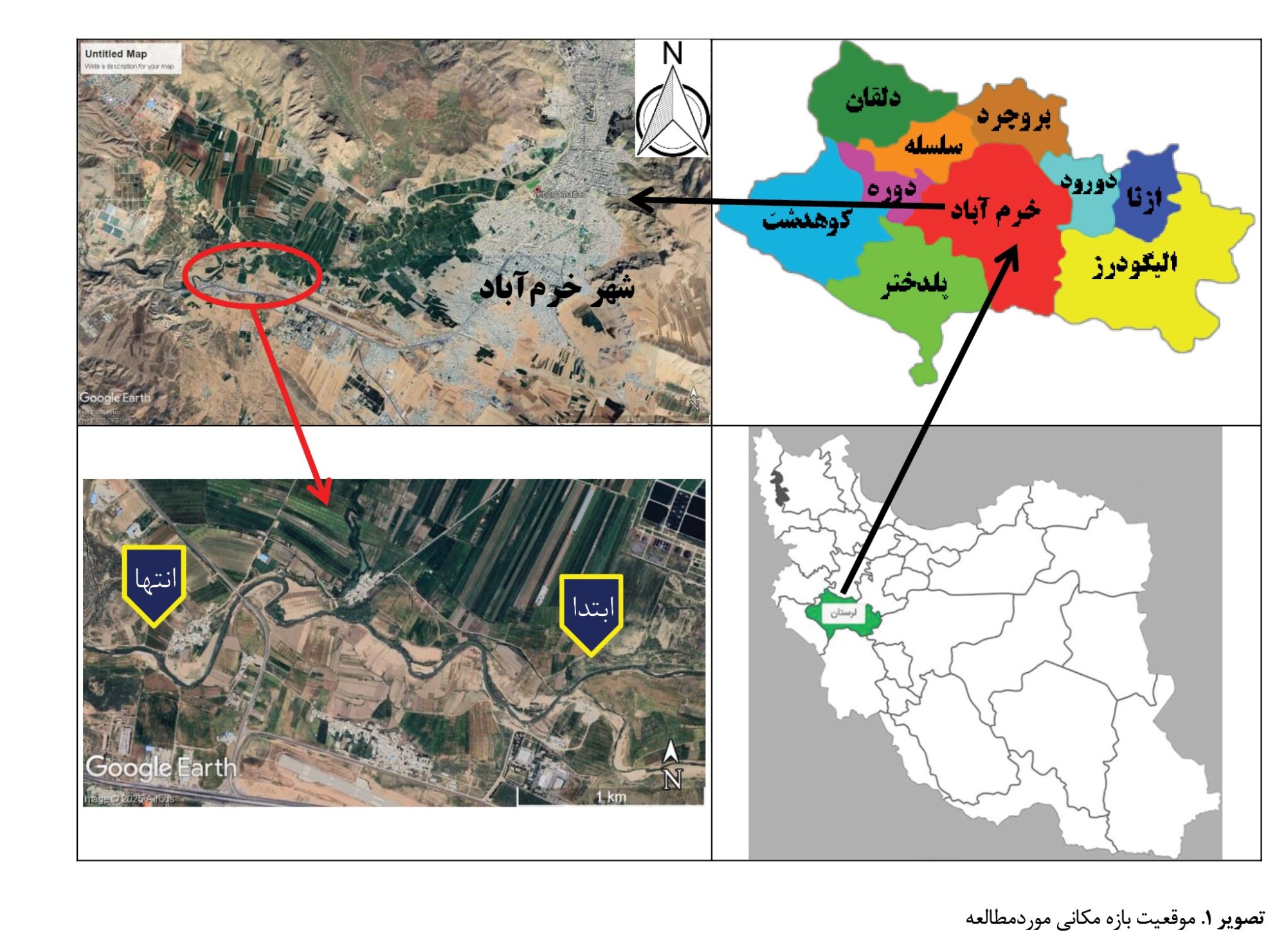 منطقه موردمطالعه بازهای از رودخانه پاییندست شهر خرمآباد- استان لرستان به طول 3 کیلومتر و در منطقهای موسوم به چمانجیر واقع گردیده که در واقع خروجی حوزه آبخیز رودخانه خرمآباد است. موقعیت این بازه بین مختصات جغرافیایی (ابتدای بازه، 247128.7:X و 3704013.16:Y:) و (انتهای بازه، 245084.7:X: و 3704099:Y:) قرار گرفته است. حوزه آبخیز این رودخانه جزء زیرحوزههای رودخانه کشکان میباشد. رودخانه خرمآباد از تلاقی دو سرشاخه کرگانه و رباط در محل شهر خرمآباد تشکیل و در محل دوآب در فاصل 40 کیلومتری شهر خرمآباد به رودخانه کشکان میپیوندد. ایستگاه هیدرومتری چم انجیر در خروجی بازه موردمطالعه واقع شده است (تصویر شماره 1).