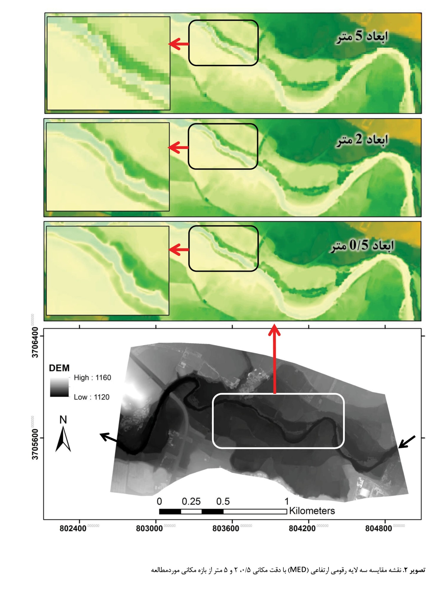 بااینحال نتایج این تحقیق نشان می دهد در شرایط دبی سیلابی (واقعه فروردین سال 1398 با دبی 1000 مترمکعب بر ثانیه)، اختلاف متغیرهای جریان سیلاب (عمق و سرعت جریان) بین سه مدل رقومی ارتفاعی (0/5، 2 و 3 متر) معنادار نیست. بنابراین هنگامی دبی جریان آب به حدی افزایش یابد که از لبه مقطع پر کانال عبور کند و وارد دشت سیلابی شود و عرض گسترش سیل چندین برابر عرض سطح آب در کانال مقطع پر شود، تأثیر تغییر ابعاد از 2 به 5 متر بر متغیرهای عمق و سرعت جریان سیل معنادار نیست.