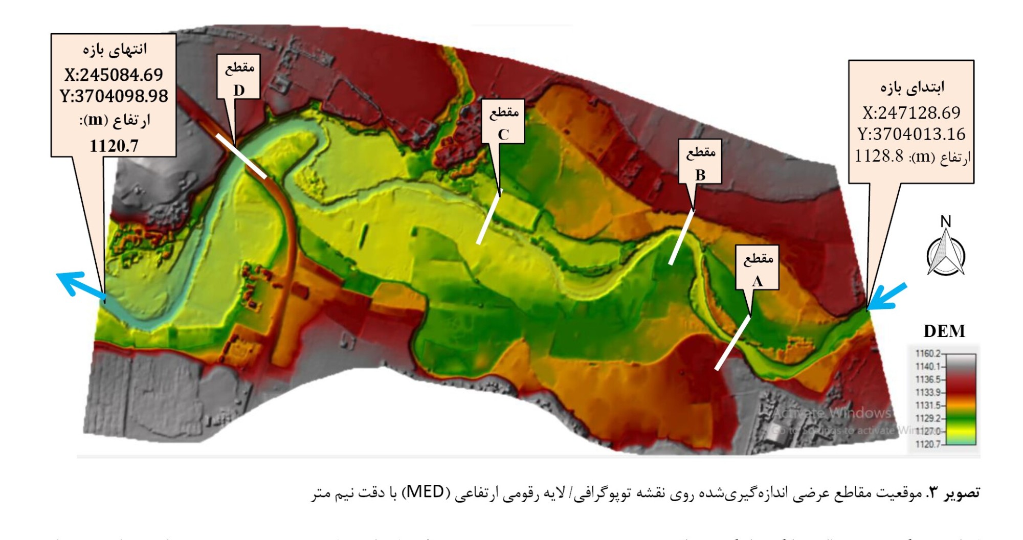 نتایج شبیهسازی شامل عمق و سرعت جریان آب براساس سه لایه رقومی ارتفاعی فوقالذکر با مقادیر اندازهگیریشده در چهار مقطع عرضی از بازه موردمطالعه برای دبیهای مذکور مقایسه گردید. تحلیلهای انجامشده از طریق ارزیابی پارامترهای اندازهگیریشده (عمق، سرعت و عرض گسترش جریان) و نتایج شبیهسازی چهار مقطع مشاهداتی، همراه با معیارهای آماری ارزیابی شامل جذر میانگین مربع خطا (RMSE) و میانگین درصد خطای مطلق (MAPE) انجام شد که روابط آنها در فرمولهای شماره 2 و 3 قابل مشاهده است: