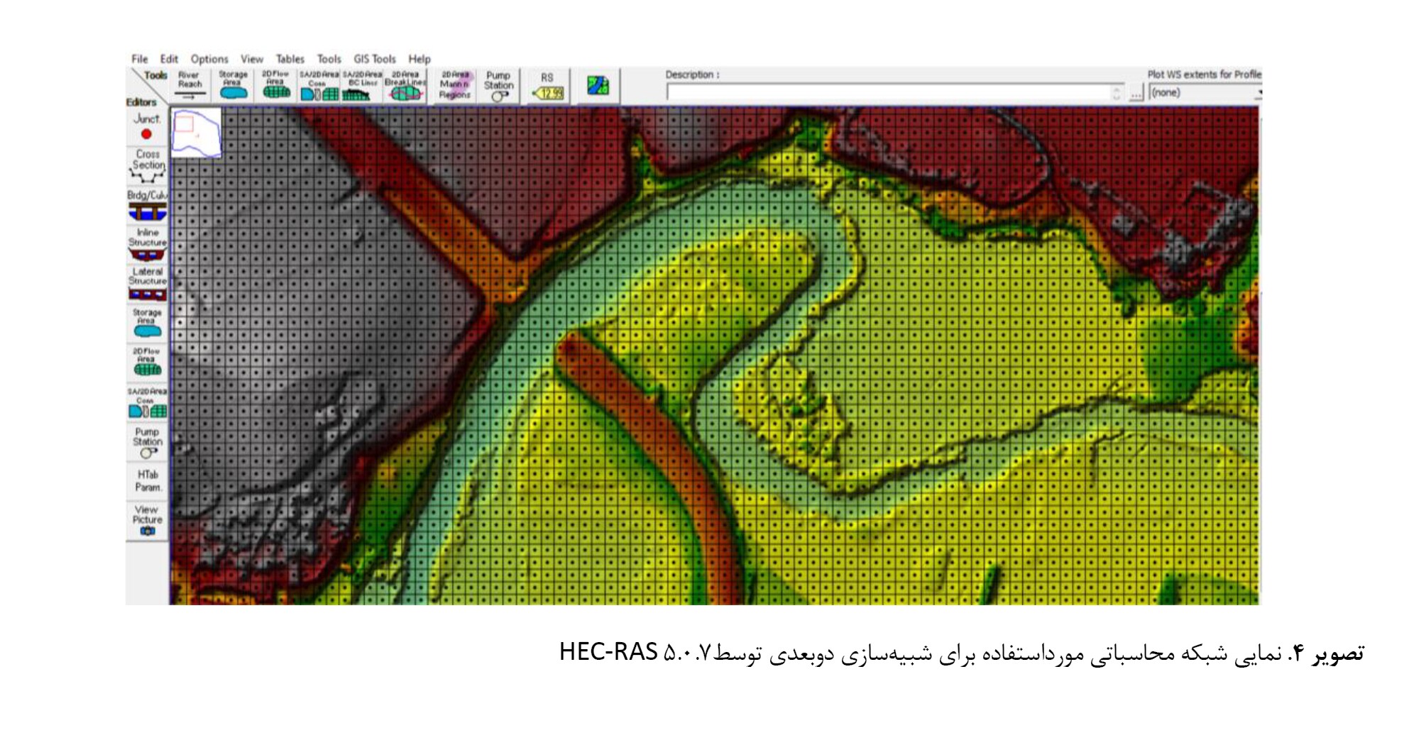 نقشه توپوگرافی بزرگمقیاس به فرمت hdf برای بارگذاری به نرمافزار HEC-RAS تبدیل شدند. پس از ورود دادههای هندسیبه محیط نرمافزار و تعیین مرزها، محدوده موردنظر با استفاده از روشهای جبری و محاسباتی شبکهبندی شد. ابعاد بهینه شبکه بر مبنای دقت لازم و زمان اختصاصیافته بهمنظور انجام محاسبات، انتخاب شده است (تصویر شماره 4).