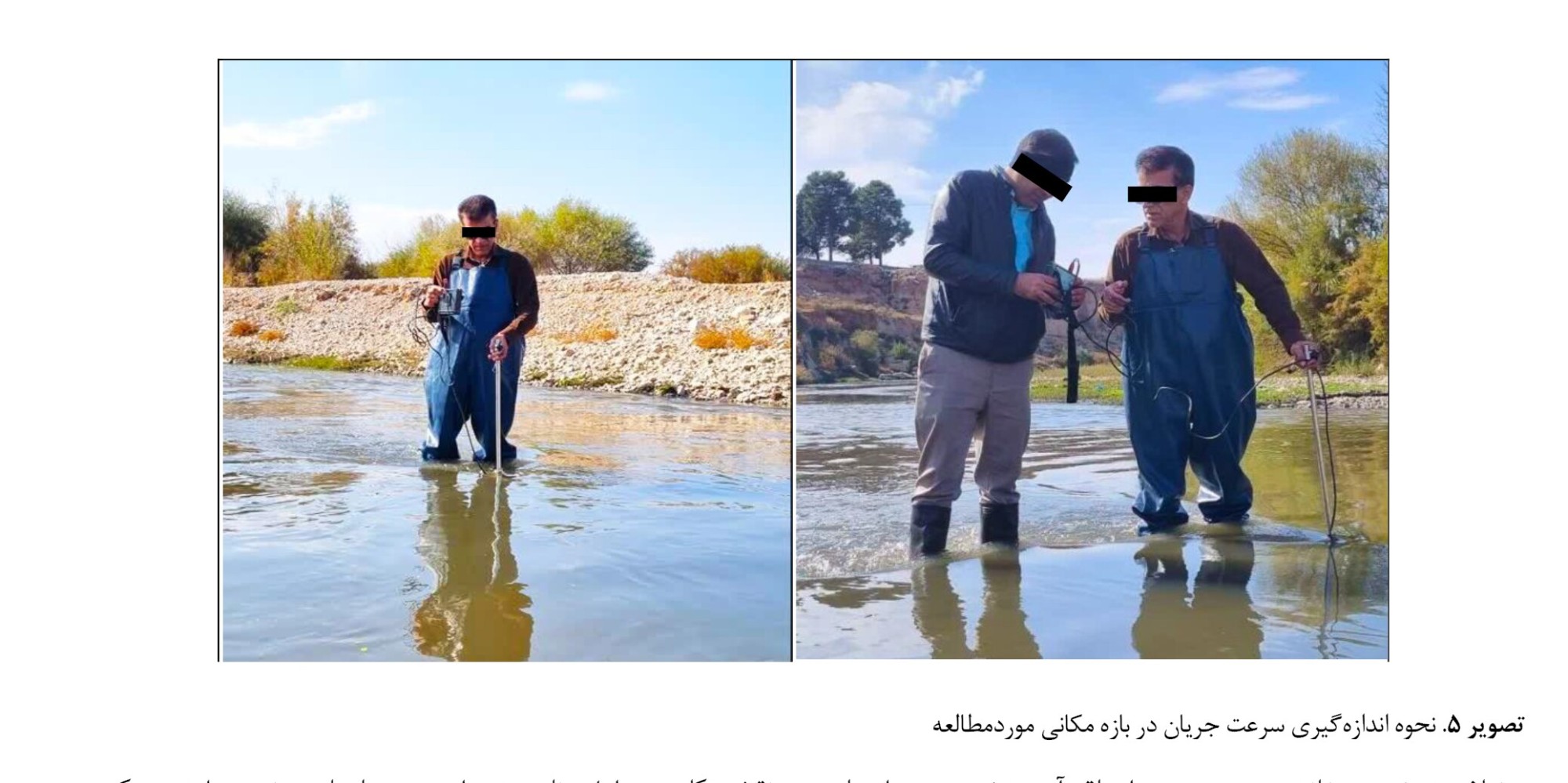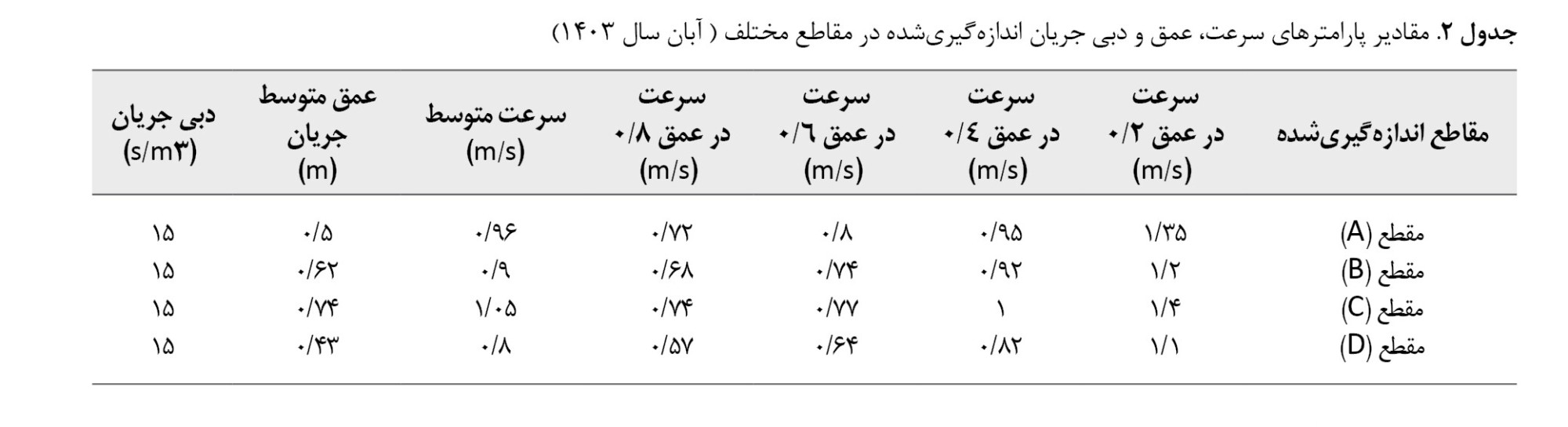 نظر به اینکه در جریانهای سیلابی، مقدار سرعت در نقاط مختلف عرض رودخانه و همچنین در اعماق آب متغیر و همراه با تلاطم است، سرعت متوسط در طول هر مقطع (باتوجهبه عرض هر مقطع) حداقل در 6 نقطه و حداکثر 10 نقطه با فواصل مساوی از عمق آب اندازهگیری شد.