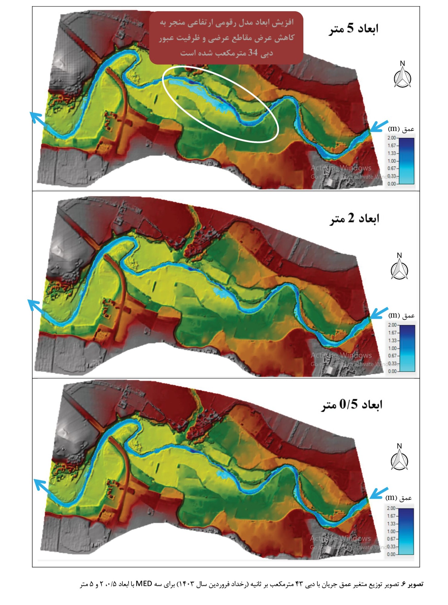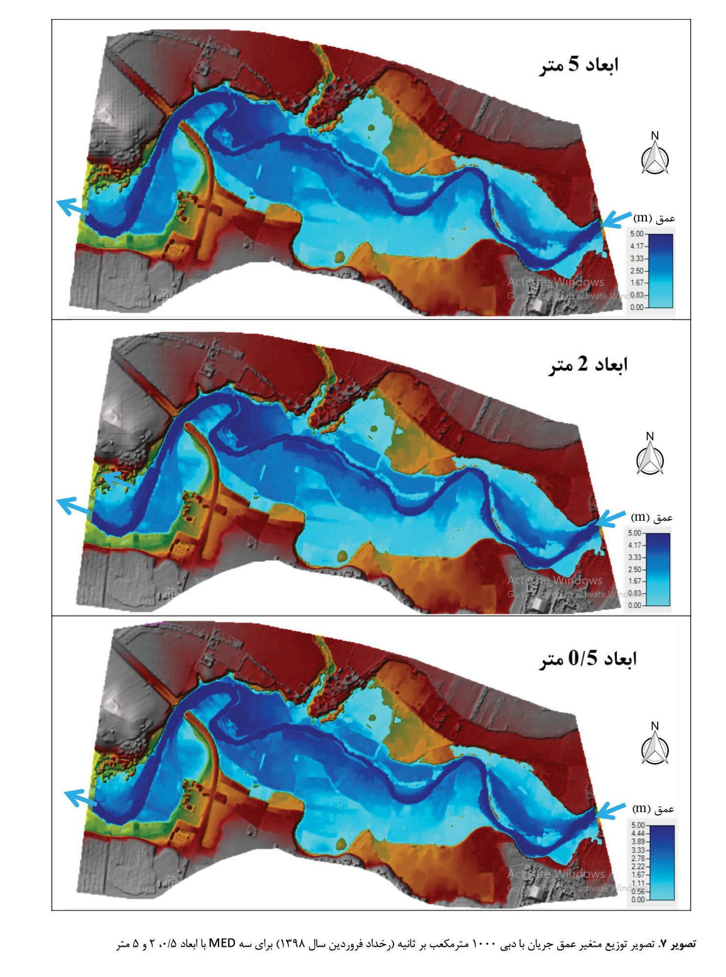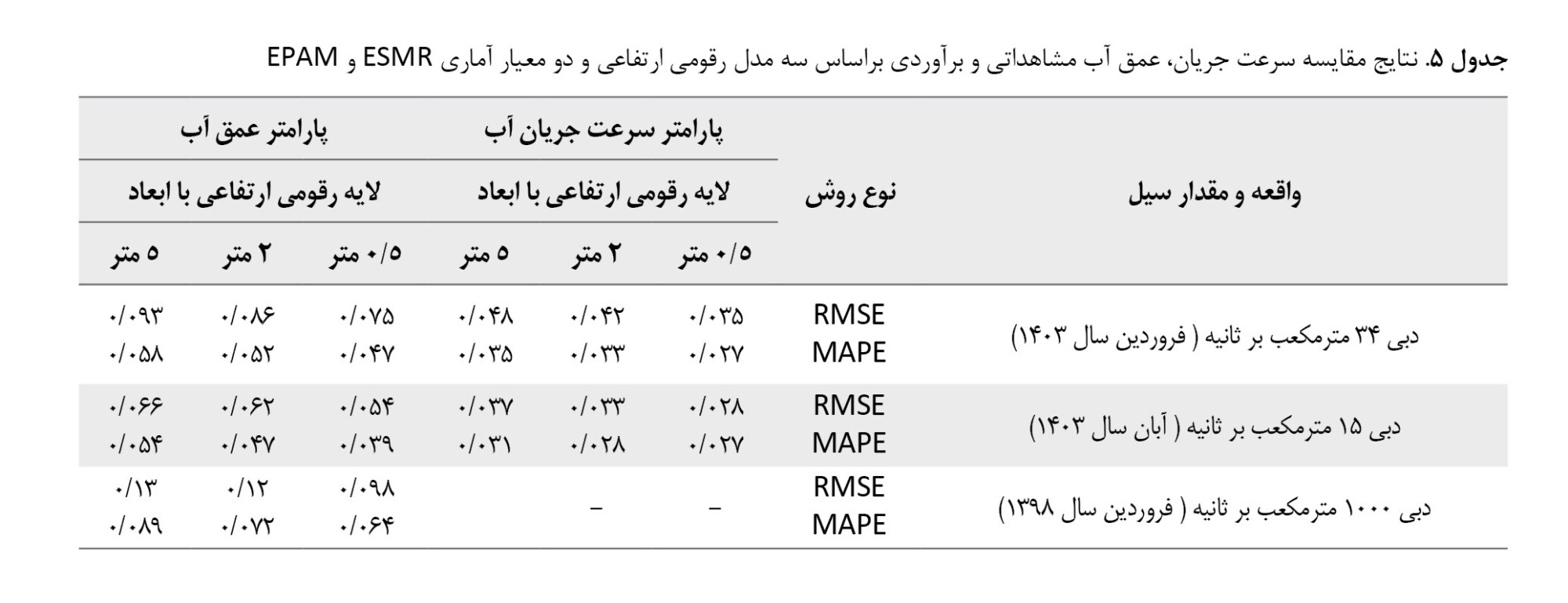 جدول شماره 5 میزان دقت و کارایی مدل در برآورد پارامترهای سرعت جریان و تراز عمق آب براساس سه مدل رقومی ارتفاعی با ابعاد 5/0، 2 و 5 متر و براساس معیارهای آماری ارزیابی RMSE و MAPE را نشان میدهد. همانگونه که در این جدول مشاهده میشود، برای سه رویداد موردمطالعه، کمترین میزان معیارهای ارزیابی برای مقادیر پیشبینیشده نسبت به اندازهگیریهای مشاهداتی (متغیرهای سرعت و عمق) مربوط به مدل رقومی ارتفاعی با دقت نیم و سپس 2 متر است.