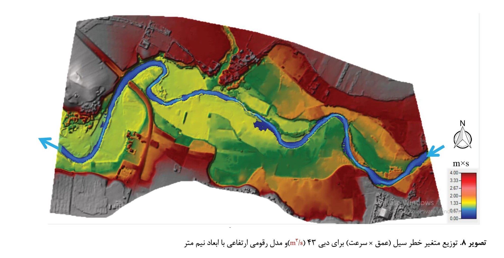 برای دبی 34 مترمکعب رو مدل رقومی ارتفاعی نیم متر، باتوجهبه اینکه بازه موردمطالعه ظرفیت عبور این جریان را دارد، مقادیر کمی پهنه خطر سیل کمتر از حد آستانه میباشد. بنابراین میزان خطر سیل در این شرایط در حالت نرمال است.