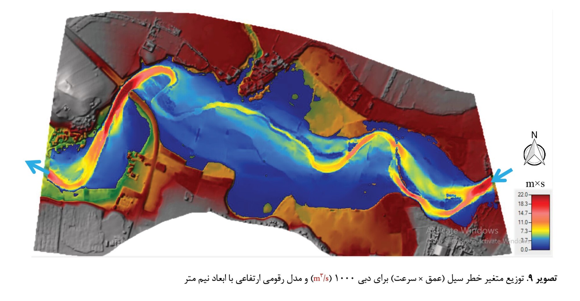 درخصوص سیل فروردین 1398 با دبی 1000 مترمکعب بر ثانیه، بهطورکلی حداکثر میزان خطر سیل در کانال مقطع پر بازه مکانی موردمطالعه میباشد. اما بهطور خاص بیشتر میزان عددی خطر سیل در محل قوس سوم/ محدوده پل (مقطع D) است. بهطور متوسط دامنه عرضی گسترش پهنه خطر سیل با مقدار بیشتر از رقم 10 حدود 160 متر است. در قوسهای بازه موردمطالعه حداکثر میزان خطر سیل در کناره خارجی اتفاق میافتد.