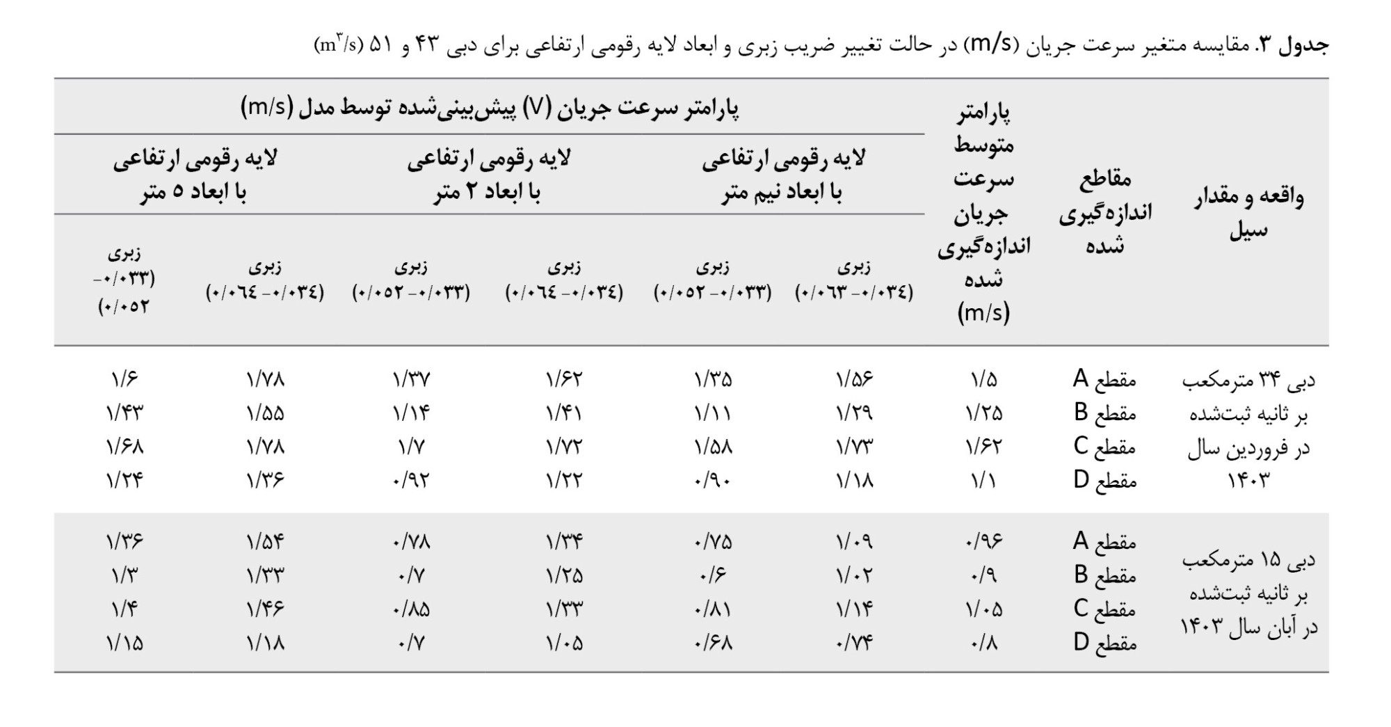 همانگونه که در جدول شماره 3 و تصویر شماره 6 مشاهده میشود، بهطورکلی برای دبی اندازهگیریشده در فروردین و آبان سال 1403، نزدیکترین مقادیر پیشبینیشده نسبت به اندازهگیریهای مشاهداتی (متغیرهای سرعت و عمق و عرض گسترش) جریان آب در 4 مقطع اندازهگیری، بهترتیب مربوط به لایه رقومی ارتفاعی با ابعاد 0/5، 2 و 5 متر و همچنین ضریب زبری در دامنه (0/033 تا 0/063) است. در شرایط دبیهای مذکور، اختلاف مقادیر برآوردی متغیرهای جریان آب با استفاده از لایه رقومی ارتفاعی با ابعاد 5 متر نسبت به لایهها با ابعاد 0/5 و 2 متر معنادار است. این امر بهدلیل تغییر هندسه کانال مقطع پر رودخانه با تغییر ابعاد لایه رقوعی ارتفاعی اتفاق میافتد. بهویژه، این تغییر روی عرض کانال مقطع پر تأثیر گذاشته است و نتایج نشان میدهد با افزایش ابعاد لایه رقومی ارتفاعی، عرض مقطع پر کانال رودخانه کاهش مییابد. لذا این تغییرات در هندسه کانال، به تغییر عمق و سرعت جریان آب در کانال مقطع lk[v پر شده است.