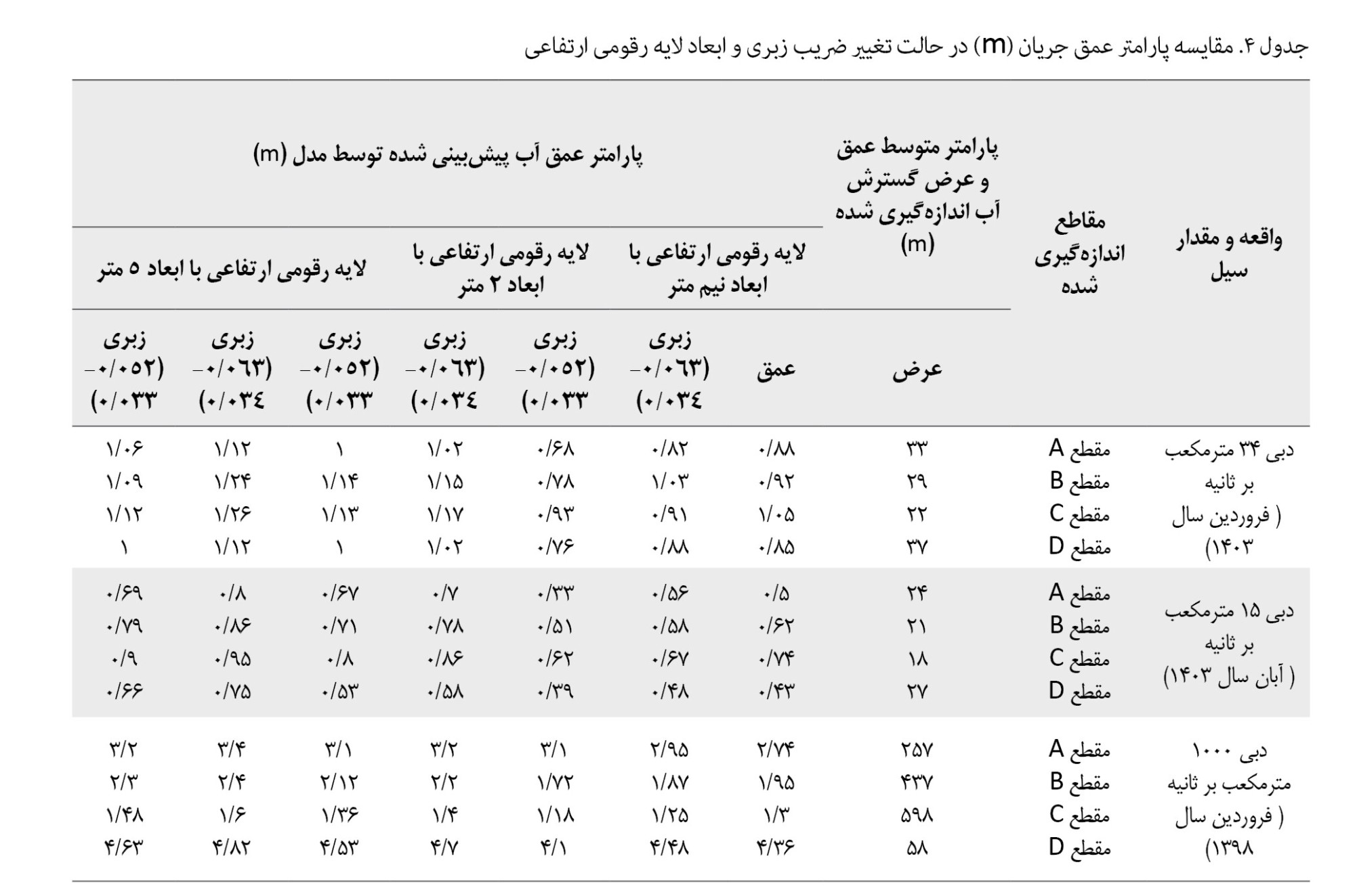 از طرف دیگر، همان طورکه در جدول شماره 4 و تصویر شماره 7 نشان داده شده است، برای واقعه فروردین سال 1398 با دبی 1000 مترمکعب بر ثانیه، مشابه دبیهای اندازهگیریشده در فروردین و آبان سال 1403، نزدیکترین مقادیر پیشبینیشده نسبت به اندازهگیریهای مشاهداتی (متغیرهای عمق و عرض گسترش) جریان آب در 4 مقطع اندازهگیری بهترتیب مربوط به لایه رقومی ارتفاعی با ابعاد 5/0، 2 و 5 متر و همچنین ضریب زبری در دامنه (0/033 تا 0/063) است.