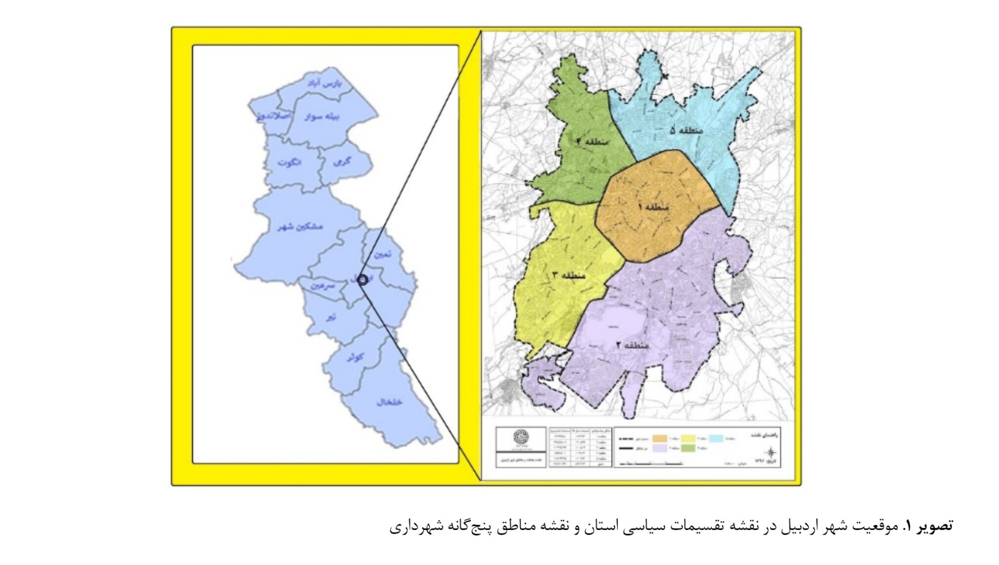 محدوده موردمطالعه در این پژوهش، شهر اردبیل میباشد. این شهر بهعنوان مرکز استان اردبیل در ظرف فضایی دشت اردبیل قرار دارد که از نظر مختصات جغرافیایی حدوداً در حد فاصل 47 درجه و 48 دقیقه تا 48 درجه و 39 دقیقه طول شرقی و 37 درجه و 56 دقیقه تا 38 درجه و 33 دقیقه عرض شمالی واقع شده و متوسط ارتفاع آن از سطح دریا 1345 متر است. براساس سرشماری عمومی نفوس و مسکن در سال 1395، جمعیت این شهر، بالغ بر 529374 نفر بوده است. موقعیت محدوده شهر اردبیل و مناطق پنجگانه شهرداری در تصویر شماره 1، نشان داده شده است.