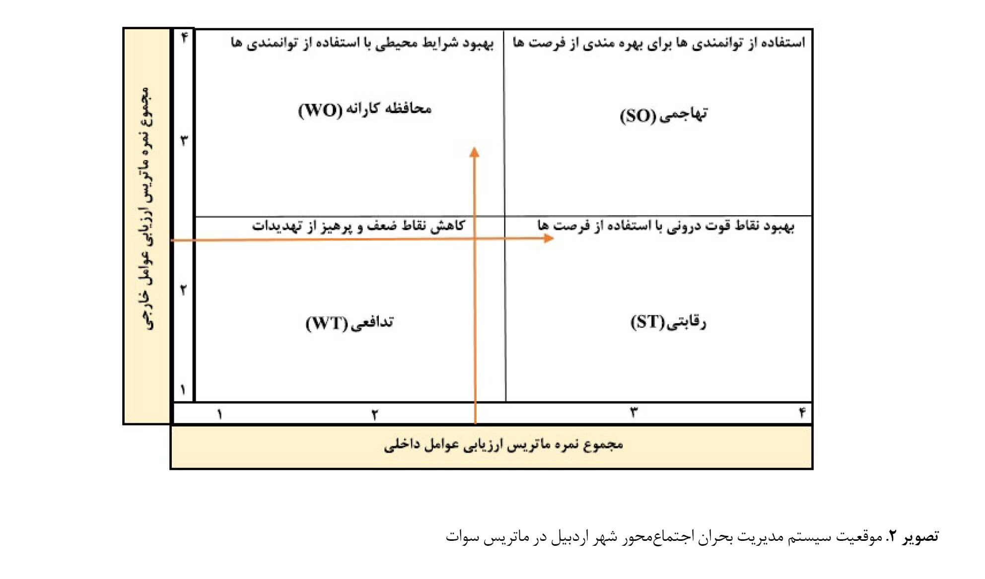 در این مرحله براساس مجموع امتیاز موزون ماتریس عوامل داخلی و ماتریس عوامل خارجی وضعیت سیستم مدیریت بحران اجتماعمحور شهر اردبیل، از بین موقعیتهای چهارگانه ماتریس سوات مشخص شده است. در ادامه مجموع امتیازهای بهدستآمده در محور X و Y ماتریس سوات ترسیم شده است تا موقعیت سیستم مدیریت بحران اجتماعمحور باتوجهبه تمامی عوامل نشان داده شود. باتوجهبه نتایج بهدستآمده از نمره ماتریس ارزیابی عوامل داخلی، نقاط ضعف در سیستم موردنظر بیشتر از نقاط قوت آن است. همچنین باتوجهبه نتایج بهدستآمده از نمره ماتریس ارزیابی عوامل خارجی، تهدیدات سیستم موردنظر بیشتر از فرصتهای آن است. بنابراین وضعیت سیستم مدیریت بحران اجتماعمحور شهر اردبیل در موقعیت تدافعی قرار دارد (تصویر شماره 2). بنابراین بهمنظور تقویت این رویکرد لازم است در راستای کاهش نقاط ضعف و پرهیز از تهدیدات برنامهریزی و اقدام کرد.