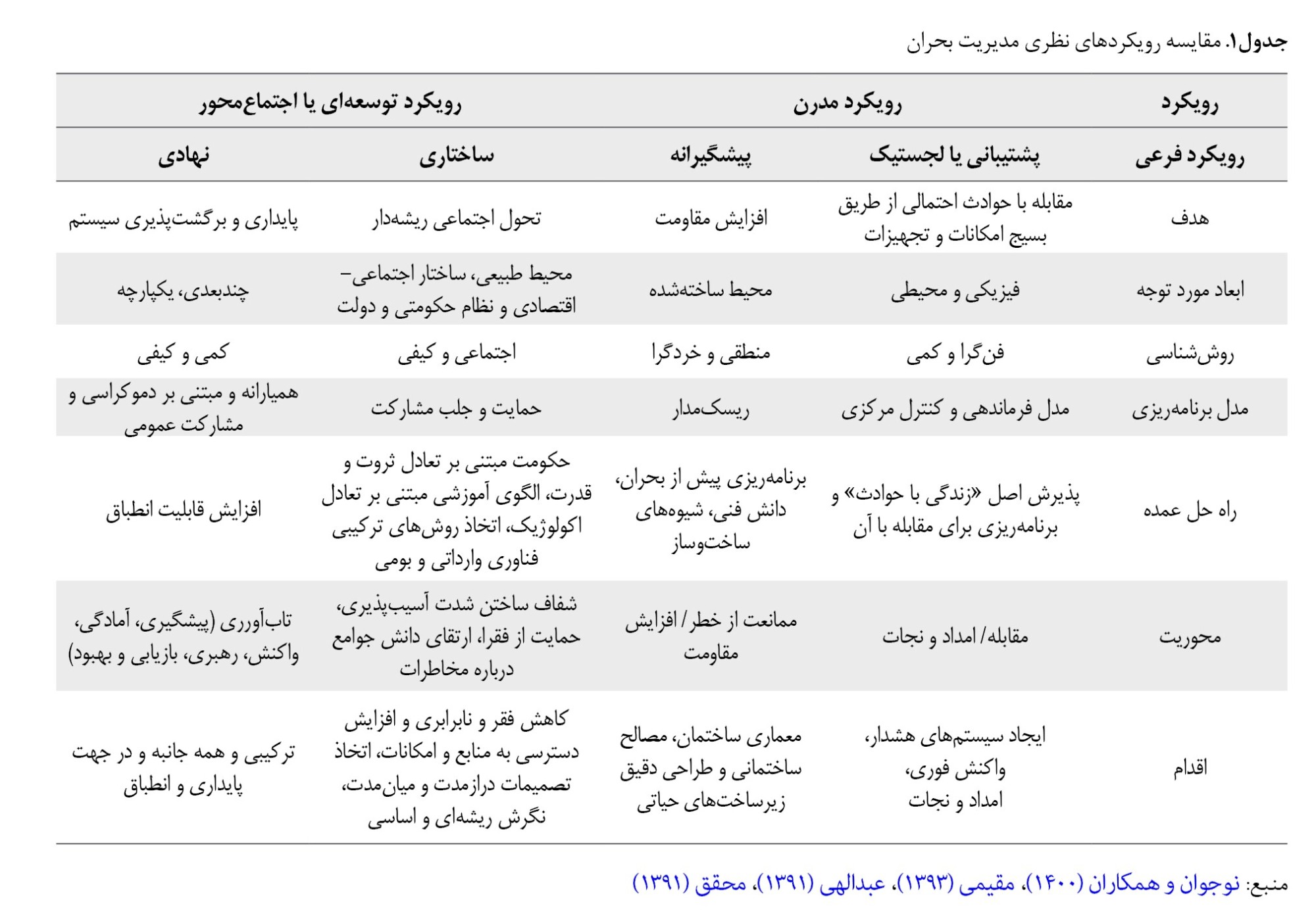 درواقع شکست رویکردهای بالا به پایین موجب شد رشتهای از مباحث اجتماعی و فرهنگی ازجمله اعتماد، ارزشها و هنجارها، سرمایه اجتماعی و ظرفیتهای انسانی در عرصه برنامهریزی و مدیریت شهری، محلی و منطقهای مورد توجه قرار گیرند (هادسون، 2004). در عرصه سیاستگذاری رویکرد نهادی، بر اصلاح و بهبود رویهها و ترتیبات نهادی محلی تأکید میگردد. در این عرصه تأکید اصلی صرفاً بر بسیج و به تحرک واداشتن نهادهای سیاسی دولتی در سطح محلی نیست، بلکه بر نقش عوامل و نهادهای غیردولتی نیز تأکید میشود (آمین، 1998). بهطور خلاصه رویکردهای شناختهشده در زمینه مدیریت بحران و مقایسه آنها در جدول شماره 1 ارائه شده است.