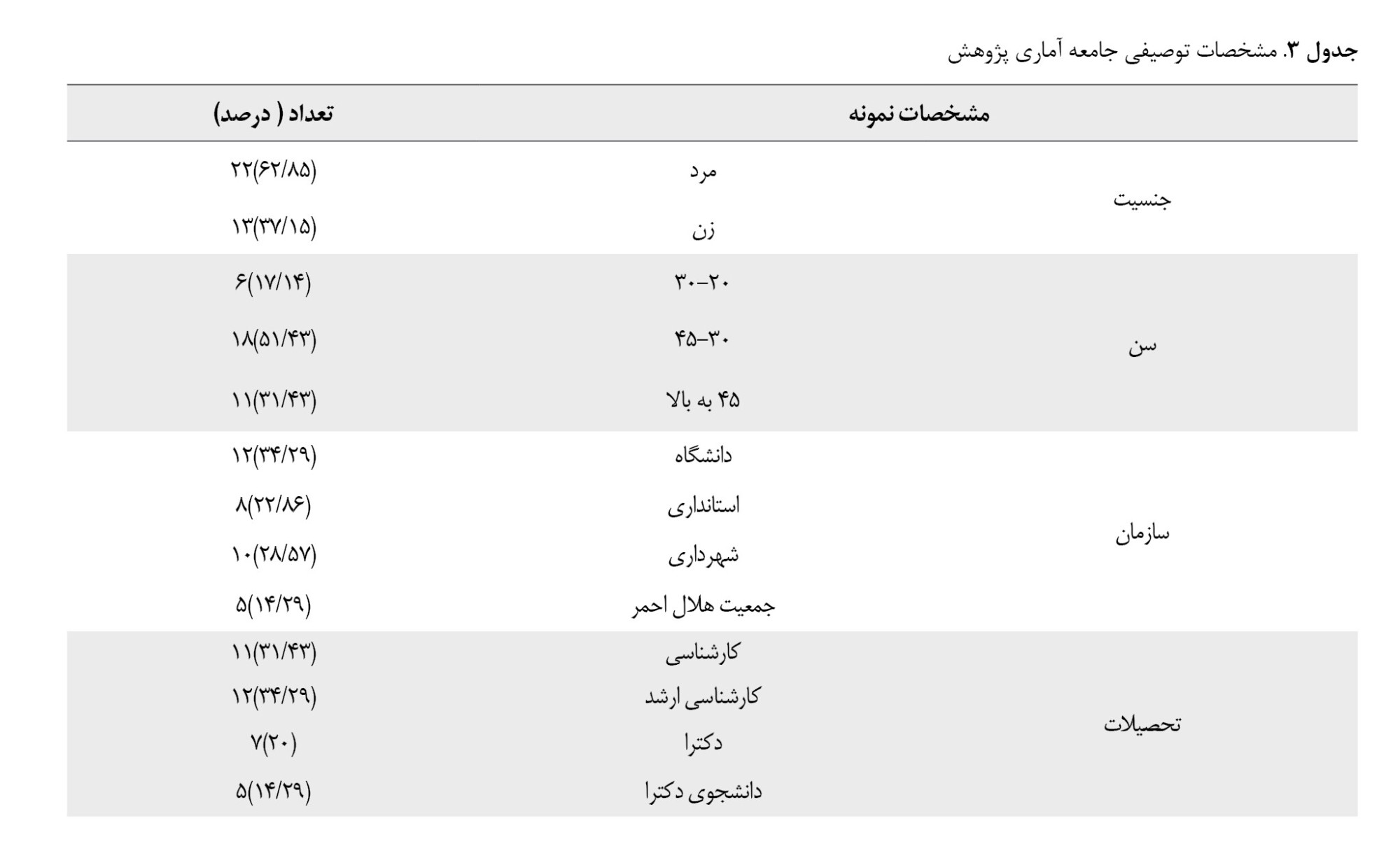 پژوهش حاضر ازلحاظ هدف، کاربردی و ازنظر ماهیت، پیمایشی و تحلیلی است. روش جمعآوری اطلاعات، کتابخانهای و میدانی میباشد. از روش کتابخانهای برای جمعآوری اطلاعات مربوط به چهارچوب نظری و شناسایی مؤلفههای پژوهش (شامل 13 مؤلفه) و همچنین مطالعه اسناد و گزارشات مربوط به اقدامات و برنامههای مرتبط با مدیریت بحران اجتماعمحور در سازمانهای متولی بحران در شهر اردبیل از جمله استانداری، شهرداری، اداره کل مدیریت بحران، جمعیت هلال احمر، دانشگاه علوم پزشکی، اداره کل آموزشوپرورش، شرکت توزیع نیروی برق، شرکت آب و فاضلاب، شرکت گاز، اداره بهزیستی، کمیته امداد امام خمینی، اداره کل تأمین اجتماعی، پایگاههای بسیج و سازمانهای مردمنهاد استفاده شده است. از روش میدانی برای جمعآوری دادهها از طریق تکمیل پرسشنامه استفاده شده است. جامعه آماری پژوهش 35 نفر است که شامل کارشناسان حوزه مدیریت بحران و اساتید و پژوهشگرانی که در زمینه موضوع تحقیق فعالیت دارند، میباشد که به روش نمونهگیری هدفمند انتخاب شدهاند. دلایل انتخاب آنان به این ترتیب بوده است که علاوهبر مرتبط بودن با ماهیت موضوع پژوهش حاضر، تجربیات عملی و اجرایی لازم را داشتند (جدول شماره 3).