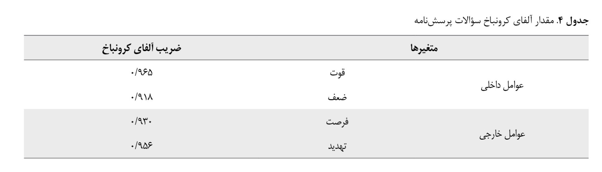 برای تجزیهوتحلیل دادهها با هدف ارائه راهبردها جهت تقویت رویکرد اجتماعمحور در سیستم مدیریت بحران شهر اردبیل از روش سوات استفاده شده است. برای این منظور ابتدا از طریق بررسی اسناد و بهکارگیری تکنیک پیمایش محیطی، پیشنویس اولیه عوامل داخلی (نقاط قوت و نقاط ضعف) و عوامل خارجی (فرصتها و تهدیدات) تهیه و سپس با استفاده از نظرات کارشناسان غربالگری شدهاند. به این ترتیب که عوامل داخلی و خارجی بهصورت سؤالات پرسشنامه در قالب طیف لیکرت 5 درجه تهیه و عدد 3 بهعنوان حد آستانه برای انتخاب متغیرهای نهایی در نظر گرفته شد. روایی سؤالات پرسشنامه توسط اساتید دانشگاه و کارشناسان مورد تأیید قرار گرفته و پایایی آنها با استفاده ازضریب آلفای کرونباخ به دست آمده است (جدول شماره 4).