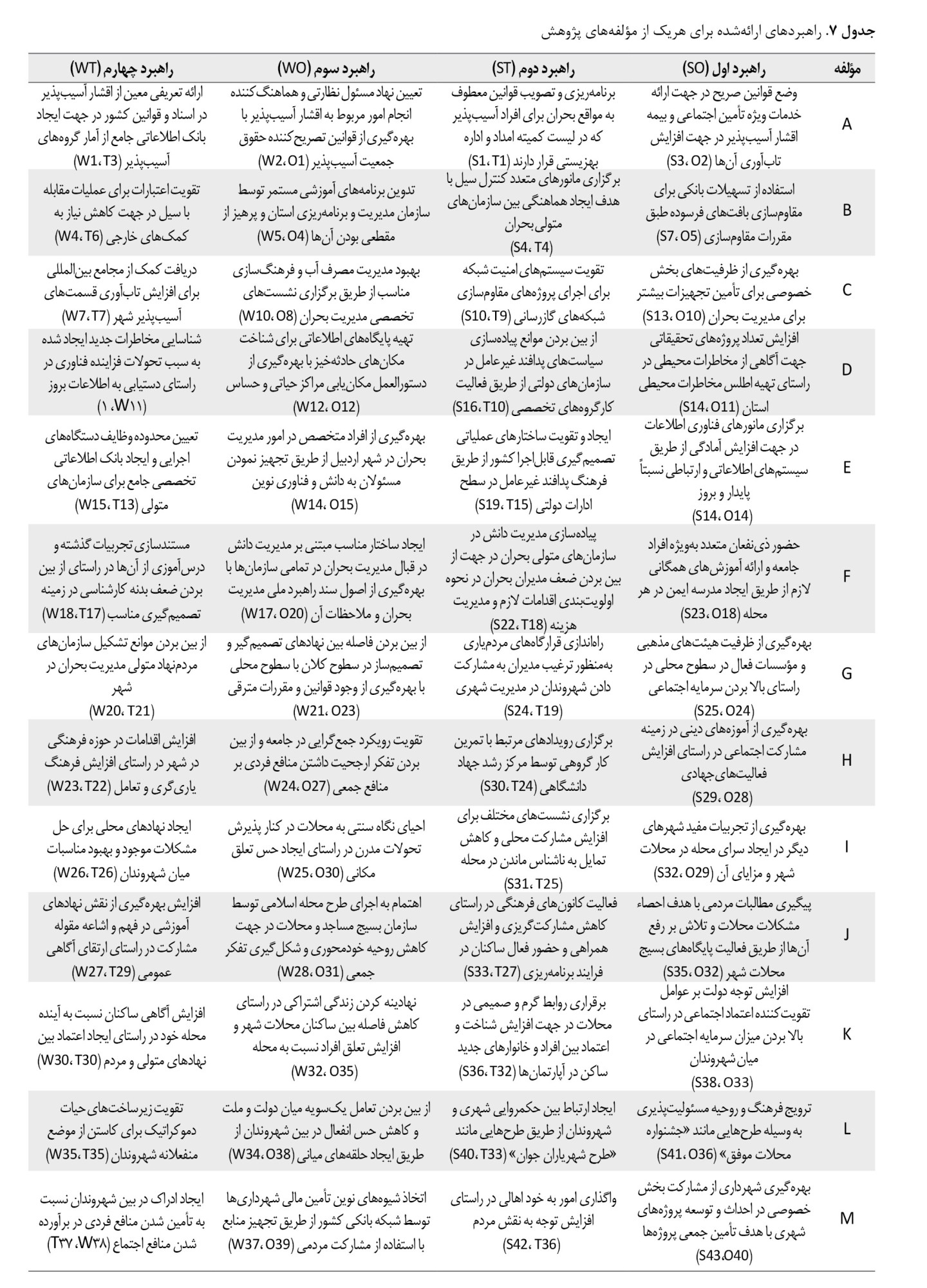 دجینگ (2023) بر نقش آموزش، افزایش درک و آگاهی مردم از مخاطرات محیطی و بهبود سیستم اطلاعرسانی در تقویت مشارکت همگانی در مدیریت بحران تأکید دارد. همچنان که از بررسی منابع خارجی و داخلی دررابطهبا مدیریت بحران اجتماعمحور برمیآید؛ مطالعات و پژوهشهای متعددی در این زمینه صورت گرفته است، اما در خصوص ارائه راهبردهای منطبق بر شرایط و وضعیت جوامع محلی تحقیقات اندکی وجود دارد. جدول شماره 2، مؤلفههای رویکرد اجتماعمحور در سیستم مدیریت بحران را نشان میدهد که براساس مطالعه پیشینه نظری و عملی موضوع پژوهش شناسایی شده است.