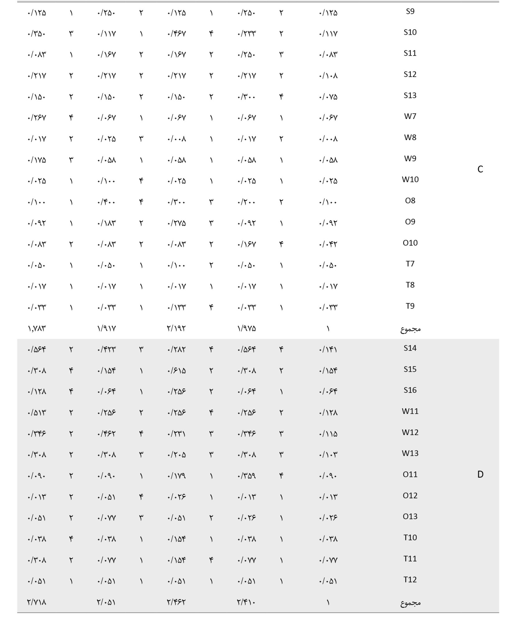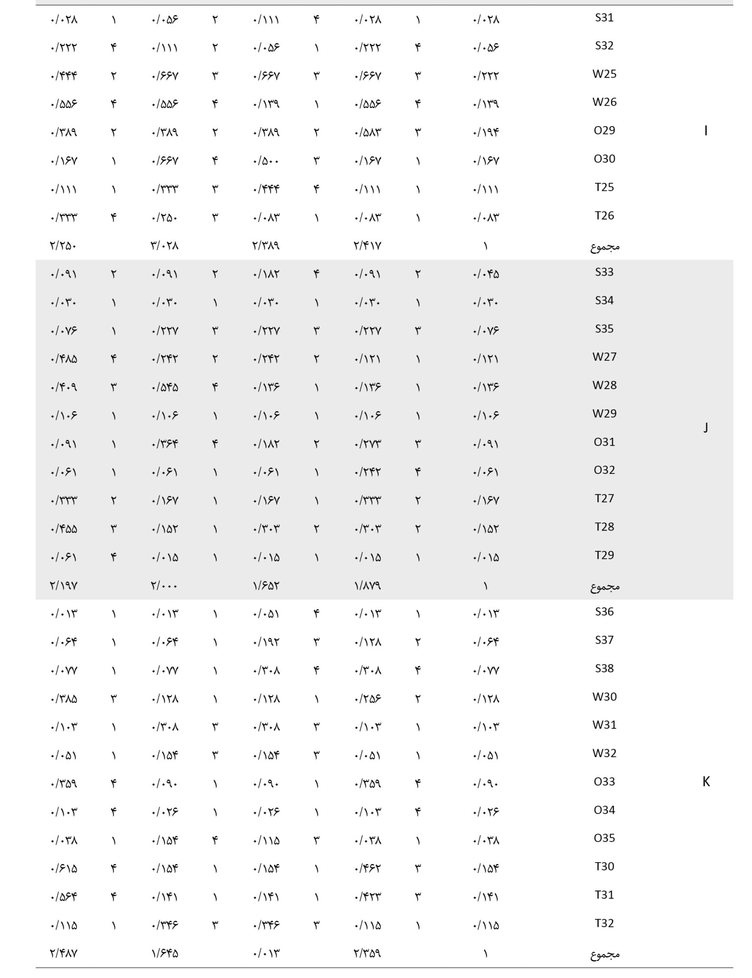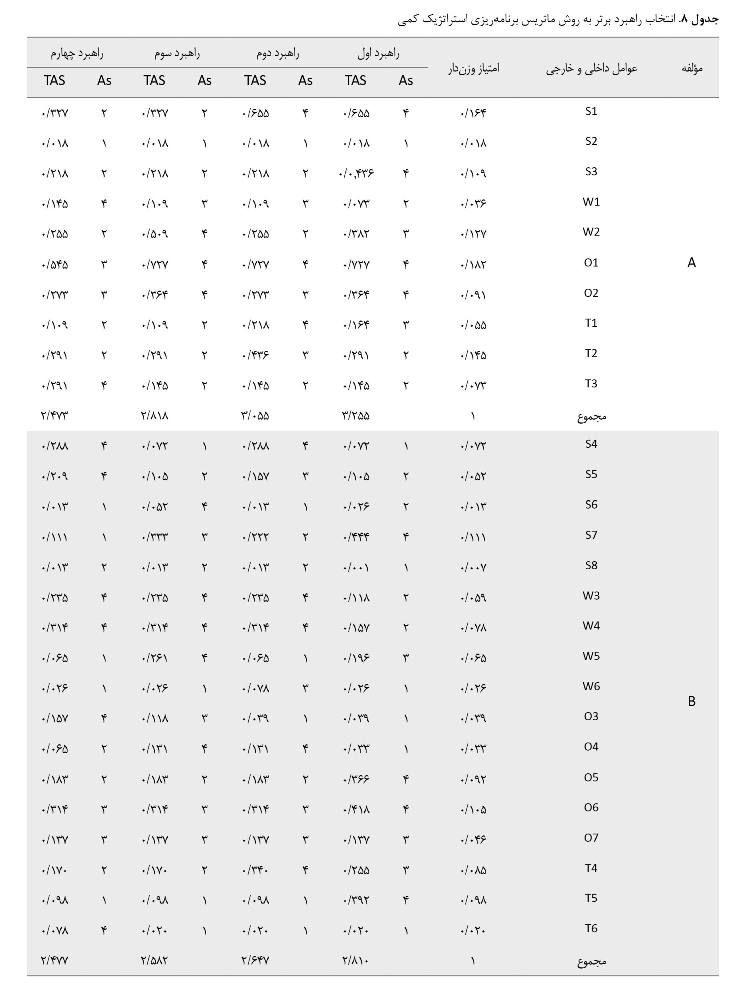 در این بخش از پژوهش برای انتخاب راهبرد برتر از بین راهبردهای ارائهشده برای هر مؤلفه، از روش ماتریس برنامهریزی استراتژیک کمی استفاده شده است. بدین منظور با بهرهگیری از نظرات کارشناسان، نخست برای هریک از عوامل داخلی و خارجی مؤلفهها، وزنی بین (0) تا (1) اختصاص داده شده است، بهطوریکه نهایتاً مجموع اوزان برابر با 1 باشد. در ادامه به هریک از عوامل باتوجهبه جذابیت آنها عددی بین (1) تا (4) اختصاص داده شده است. حاصلضرب امتیاز موزون هر عامل در امتیاز جذابیت آن (AS) نشانگر امتیاز کل جذابیت (TAS) هر عامل خواهد بود. درنهایت راهبردی که بیشترین نمره مجموع امتیاز نهایی را به دست آورده است، بهعنوان راهبرد برتر انتخاب شده است (جدول شماره 8).
