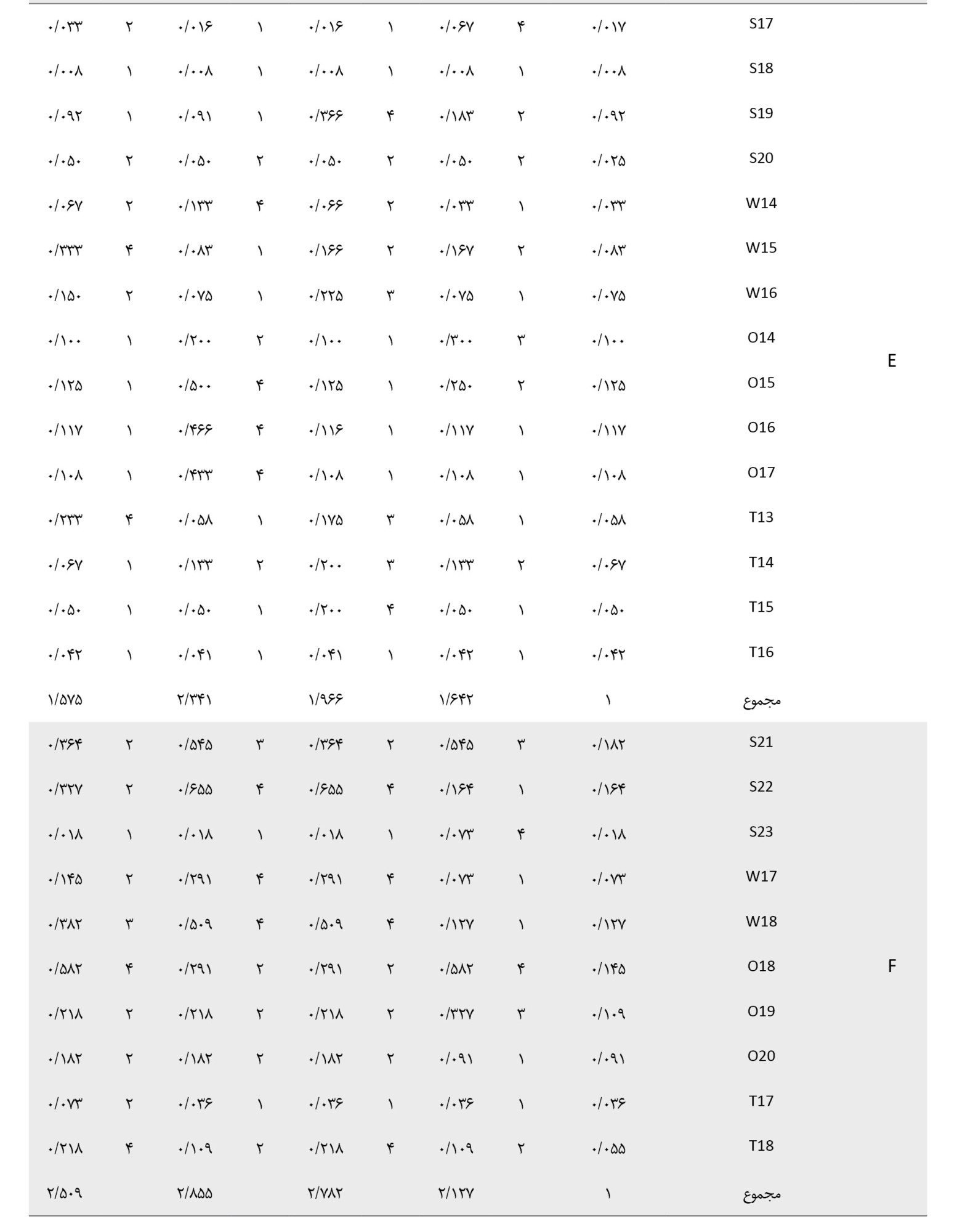 پس از تکمیل پرسشنامهها توسط کارشناسان، متغیرهایی که دارای میانگین بالاتر از 3 بوده، بهعنوان متغیرهای پژوهش انتخاب شدند؛ بهطوری که 43 متغیر برای نقاط قوت، 38 متغیر برای نقاط ضعف، 40 متغیر برای فرصتها و 38 متغیر برای تهدیدات شناسایی گردید. در ادامه به ارزیابی این عوامل بهوسیله وزندهی و رتبهبندی آنها پرداخته شده است. در گام بعد برای هریک از مؤلفههای پژوهش، با بهرهگیری از نظر کارشناسان و باتوجهبه موقعیتهای چهارگانه روش سوات، چهار راهبرد مجزا ارائه شده است. درنهایت برای انتخاب راهبرد برتر از بین راهبردهای ارائهشده برای هر مؤلفه، از روش ماتریس برنامهریزی استراتژیک کمی (QSPM) بهره گرفته شده است.