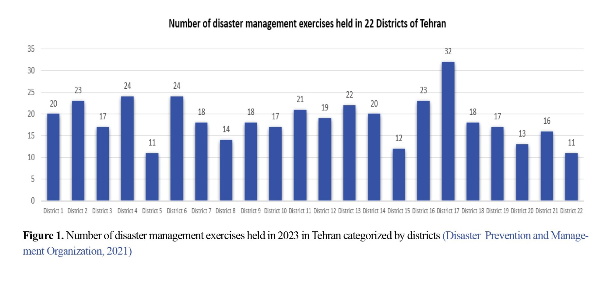Given the diversity of population contexts and different hazards in urban areas, it is necessary to conduct disaster management exercises regionally, tailored to local needs (Zabetian et al., 2014). In this regard, in Iran, various exercises (tabletop and operational) are planned and implemented annually at different levels (district, region, city) by the Tehran Disaster Mitigation and Management (TDMMO) and with the participation of the 22 district disaster management headquarters and specialized organizations, for empowering disaster management staff to learn and practice the roles and functions expected in responding to disasters and enhancing the capacities of the organizations and the actors involved. Over the past three decades, more than a thousand exercises have been conducted in the form of discussion-based and operational exercises at the regional level, encompassing 22 districts in Tehran. In 2023, 410 exercise stages were held at the regional and district levels, comprising 187 tabletop exercises and 223 operational exercises. Figure 1 shows the number of exercises held in the 22 districts of Tehran. The exercises were planned and implemented based on the prioritization of disasters.