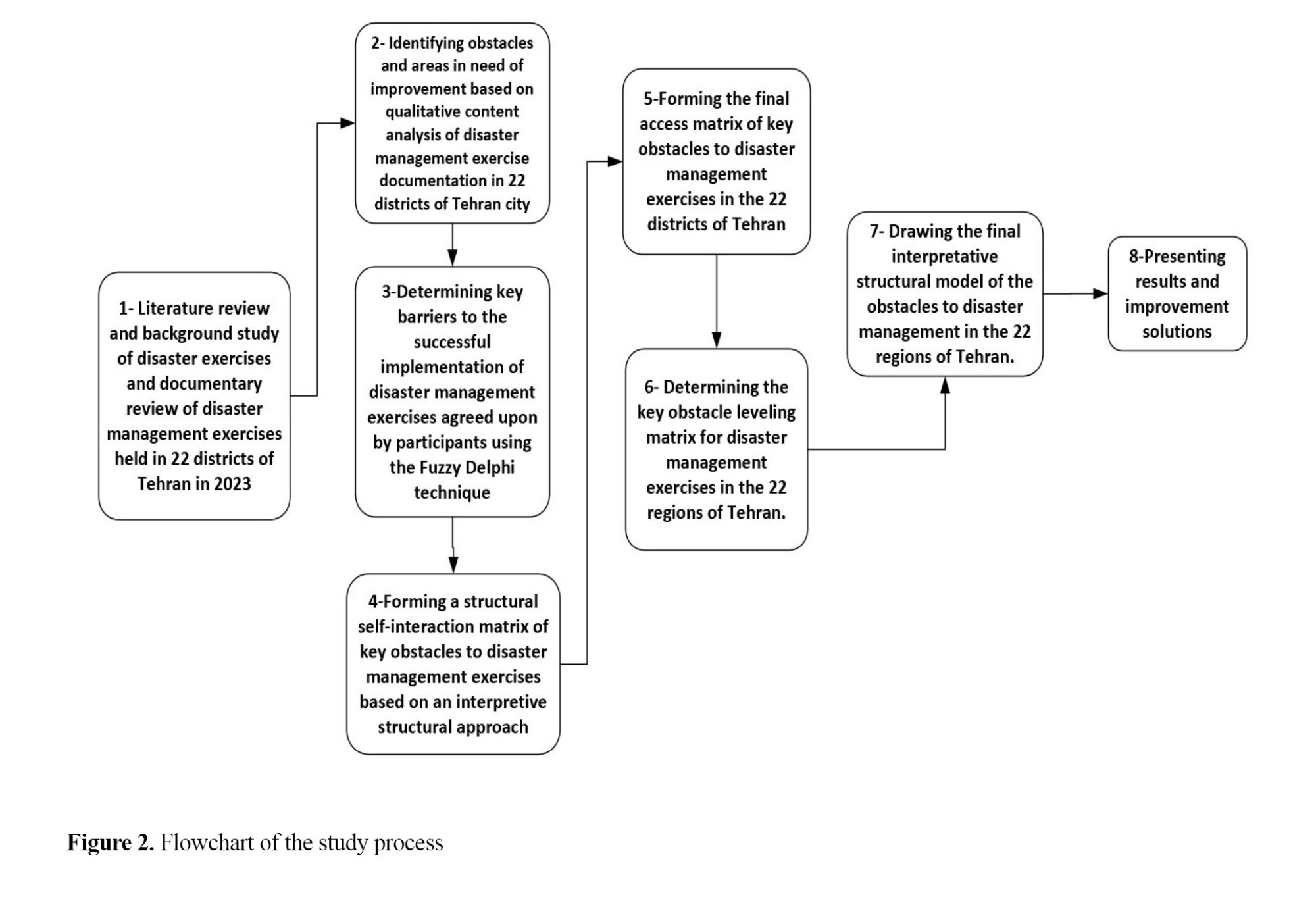 Next, based on the effectiveness of key barriers, a questionnaire was designed and completed by the experts. Then, the structural self-interaction matrix (SSIM) and the final reachability matrix (RM) were formed, the relationships between barriers were determined, and finally, the ISM diagram was drawn. Figure 2 presents the flowchart of the study process. The participants included experts, managers, and planners from the Tehran Disaster Mitigation and Management (TDMMO), who were selected purposefully based on their expertise and membership in the disaster exercise planning and execution team.