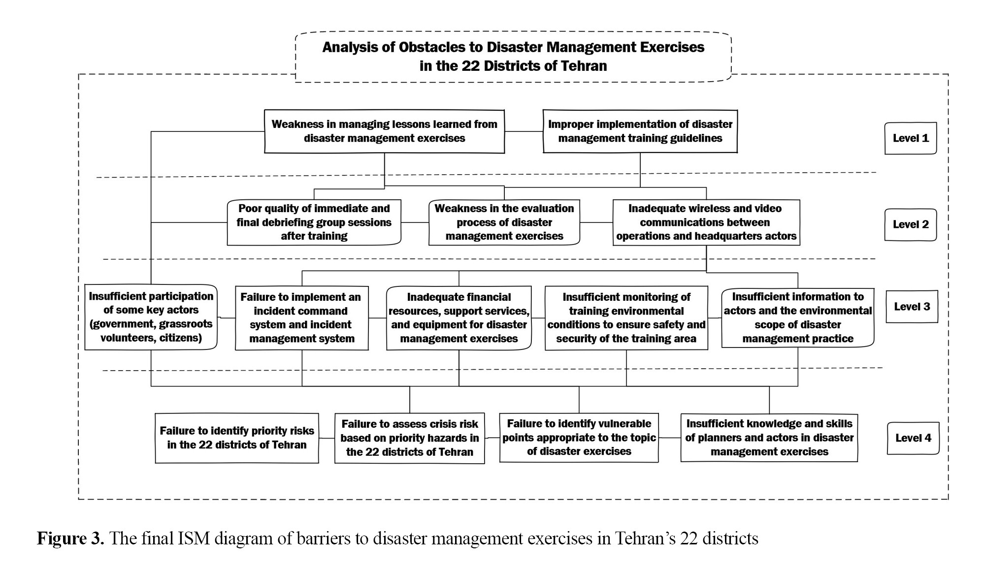 In this study, the barriers to disaster management exercises in Tehran’s 22 districts were categorized into four levels based on the ISM approach. Level 4 barriers, as the most fundamental ones indicating the areas requiring improvement in disaster management exercises, included: Insufficient knowledge and skills of exercise planners and actors, failure to identify vulnerable areas for the exercise, failure to identify priority risks, and failure to assess disaster based on priority risks. These barriers have a high impact on the effectiveness of disaster management exercises. Level 3 barriers included: Insufficient monitoring of environmental conditions to ensure safety and security of the exercise area, insufficient participation of some key actors (government, private sector, institutions, public volunteers, citizens), inadequate financial resources, support services, and equipment for the exercise; failure to implement (ICS) and incident management system (IMS, and insufficient information to actors and limited area for exercises. Level 2 barriers included: Inadequate communications (wireless or video) between operational actors and disaster management exercise headquarters, poor quality of immediate debriefing group sessions after exercise, and weakness in the evaluation process of exercises. Level 1 barriers included: Weakness in managing lessons learned from exercises, and improper implementation of exercise guidelines.