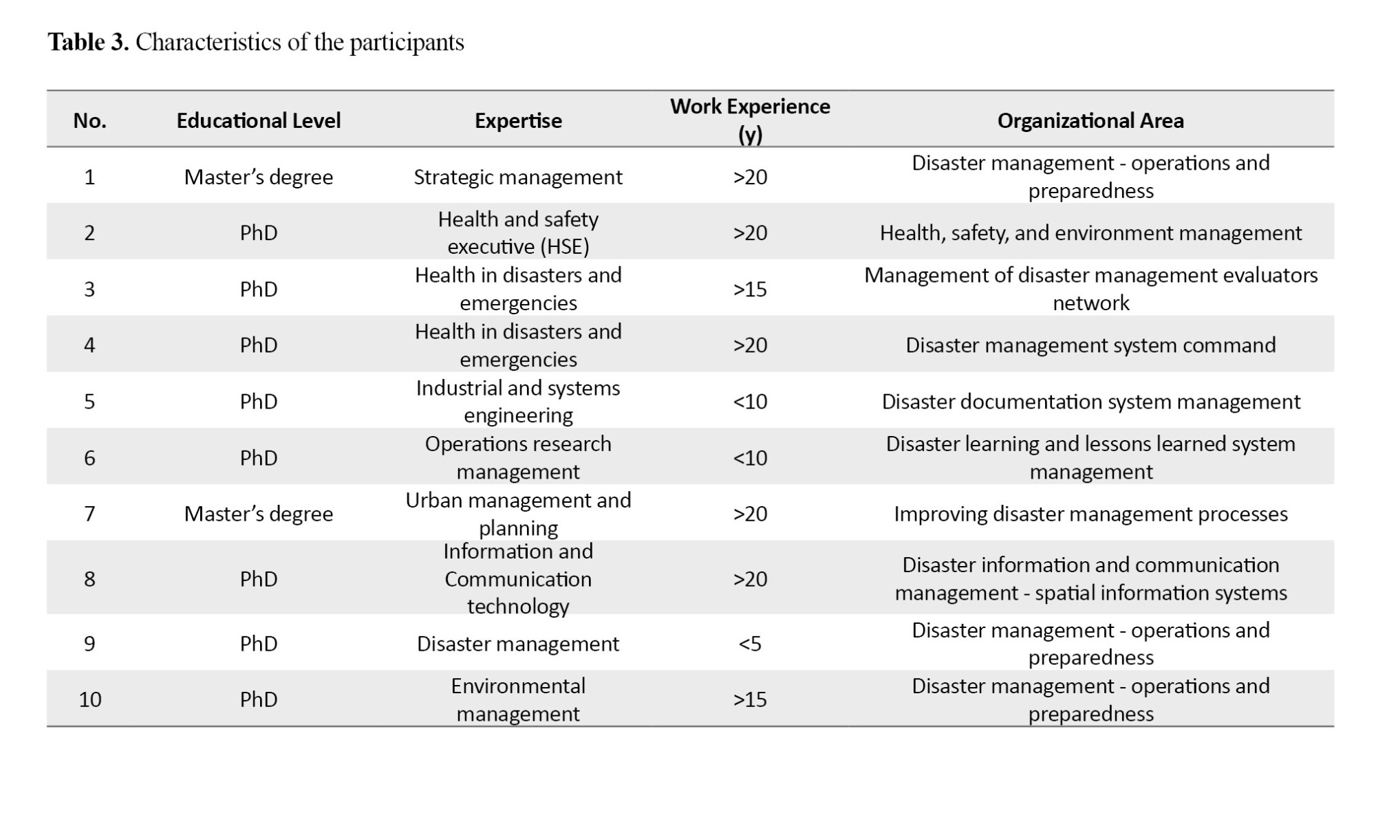 Table 1 presents the number of exercises categorized by disasters.