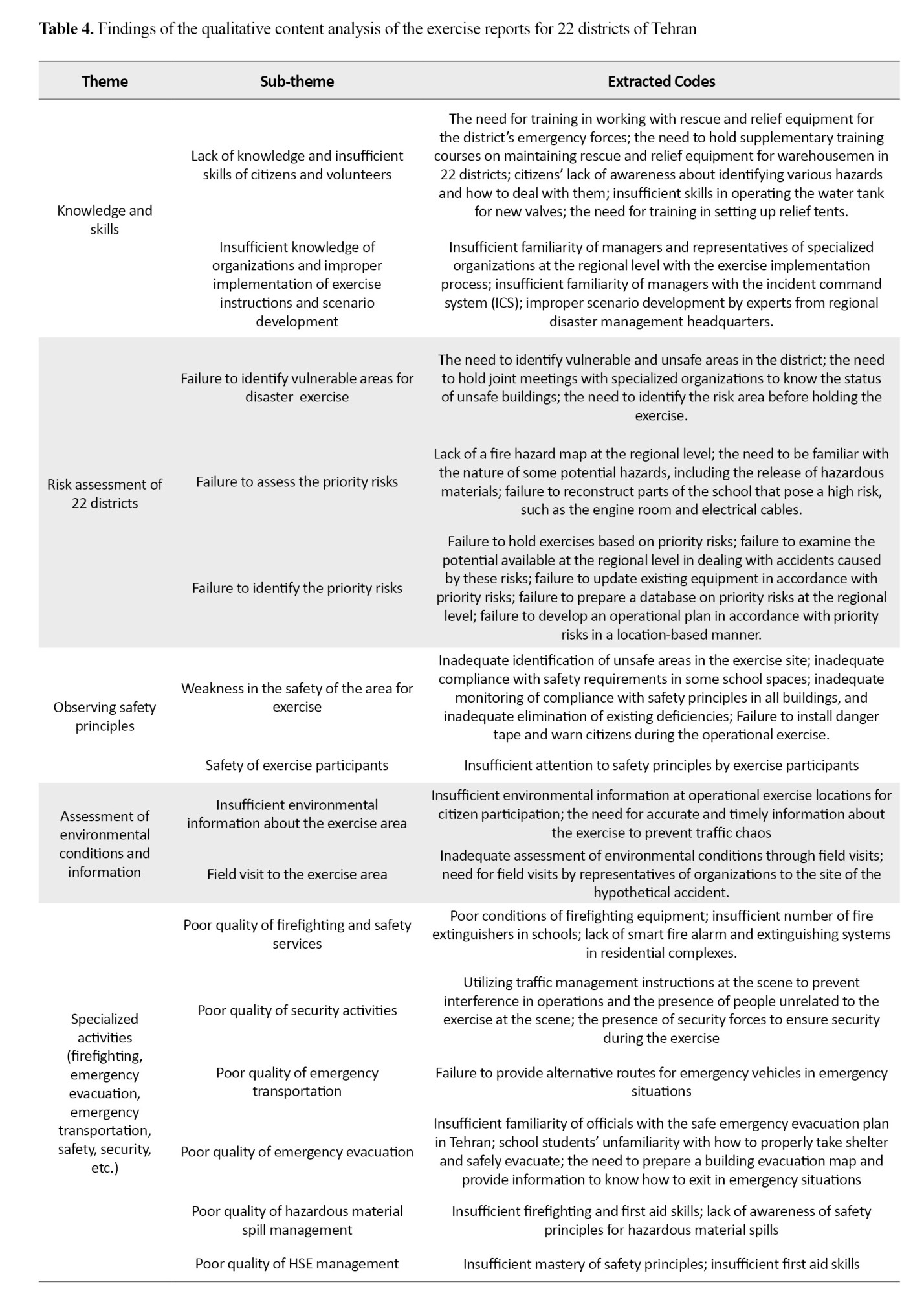 After reviewing and analyzing the content of the exercise documents and reports, a list of barriers and areas for improvement in the exercises held was first identified and categorized. The extracted barriers were classified into 10 themes and 27 sub-themes as shown in Table 4.