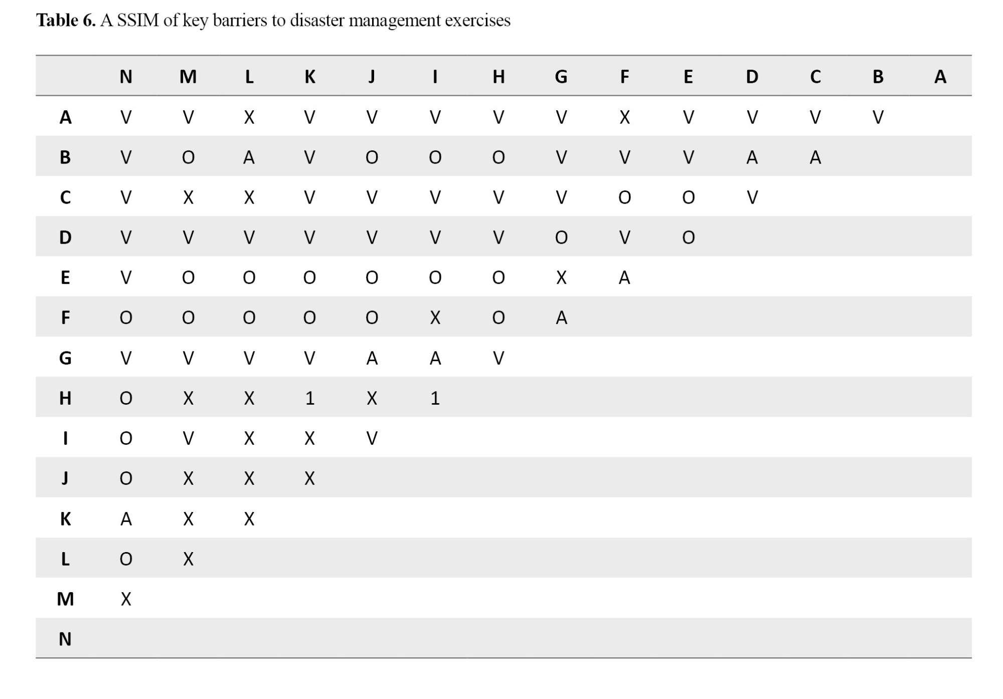 Next, based on the ISM, a questionnaire was designed to extract and determine the effectiveness and susceptibility of barriers, and experts were asked to examine the effective barriers in pairs, and based on this comparison, a SSIM was created. Based on this matrix, the respondent determined the relationships between the variables using the following symbols: V= variable i helps to realize variable j; A= variable j helps to realize variable i; X= variables i and j both help to realize each other; O= variables i and j are not related to each other. Table 6 presents the results.