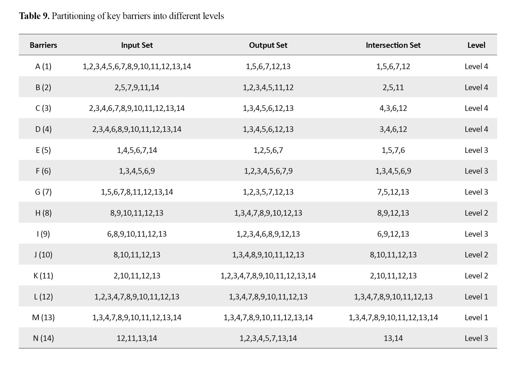 In the next step, using the final RM, the input, output, and intersection sets of each barrier were obtained (Table 9). The barriers whose reachability and intersection sets were completely similar were placed at the top of the ISM hierarchy. This operation was repeated until the components of all levels were determined.