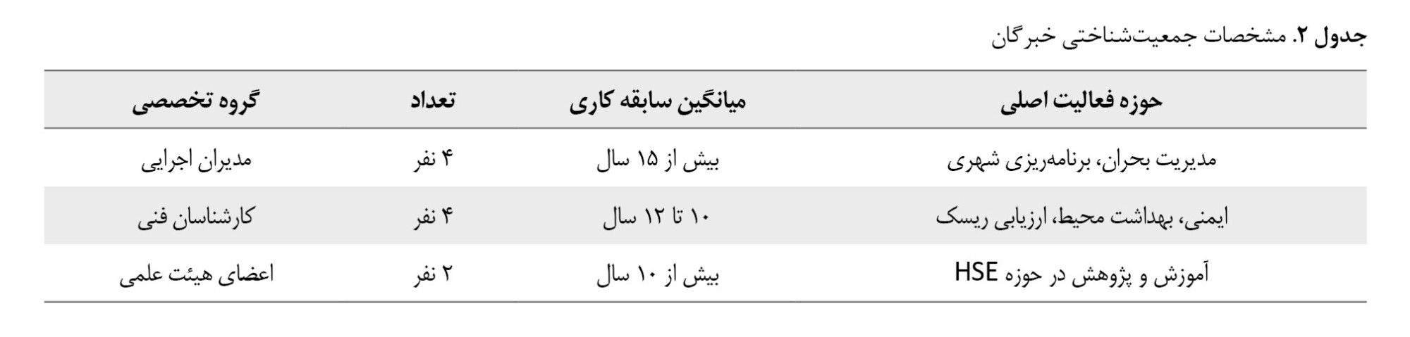 براساس دادههای گردآوریشده، فهرستی اولیه از گویههای مرتبط با سه محور اصلی سلامت، ایمنی و محیطزیست در تجمعات انبوه تهیه شد. برای اصلاح و تکمیل این فهرست، جلسات گروهی با مشارکت ۱۰ نفر از خبرگان حوزه HSE برگزار شد. ترکیب این گروه بهصورت هدفمند از سه دسته تخصصی انتخاب گردید تا تنوع دیدگاههای اجرایی، فنی و علمی در بررسی آیتمها لحاظ شود (جدول شماره 2):
