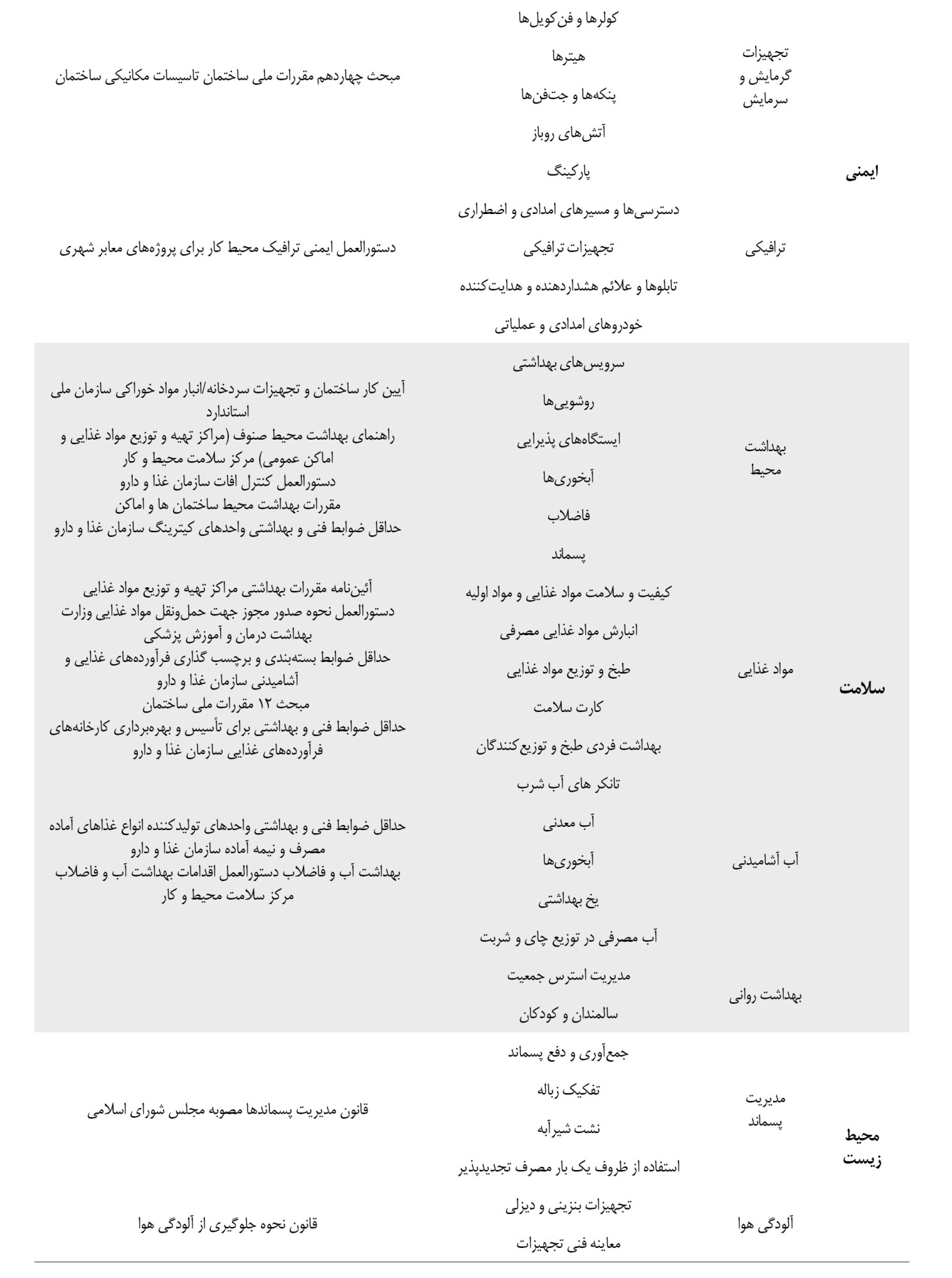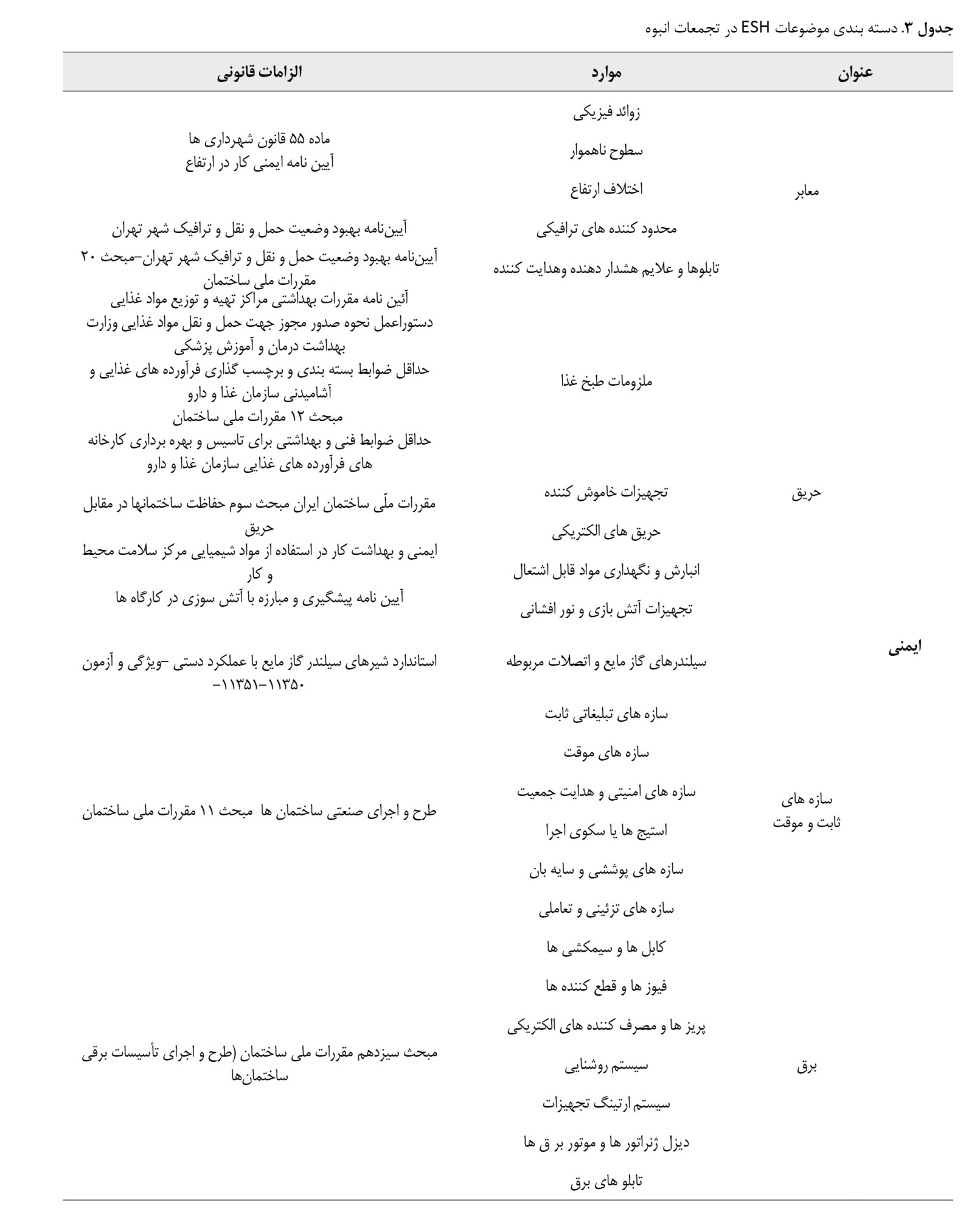 در جدول شماره 3، گویههای نهایی چکلیست در سه دسته ایمنی، سلامت و محیطزیست ارائه شدهاند. برای هر آیتم، الزامات قانونی و اسناد بالادستی مرتبط در ستون مجزا درج شدهاند تا امکان استناد و اجرای دقیق توسط پیمانکاران، مدیران اجرایی و نهادهای نظارتی فراهم گردد.