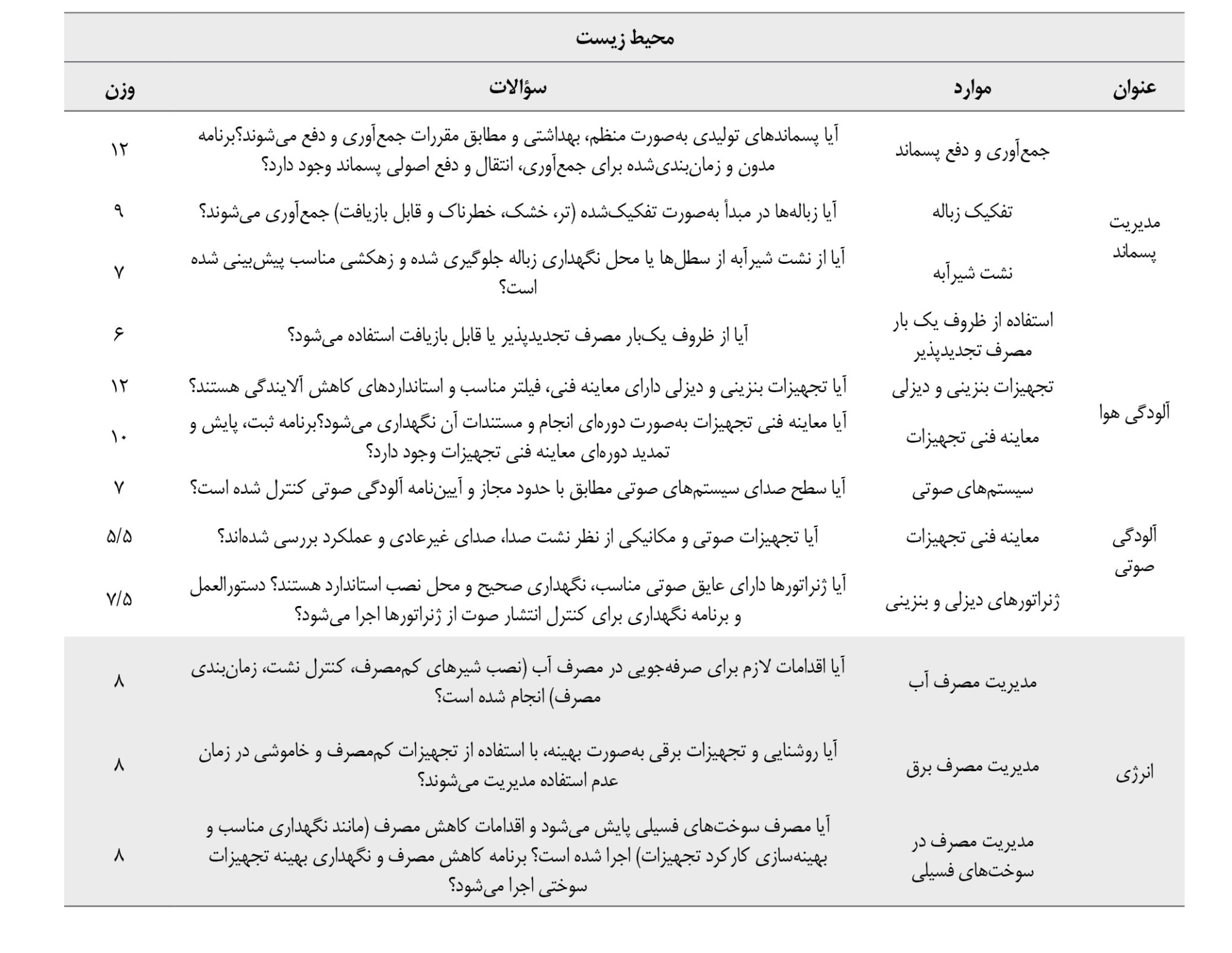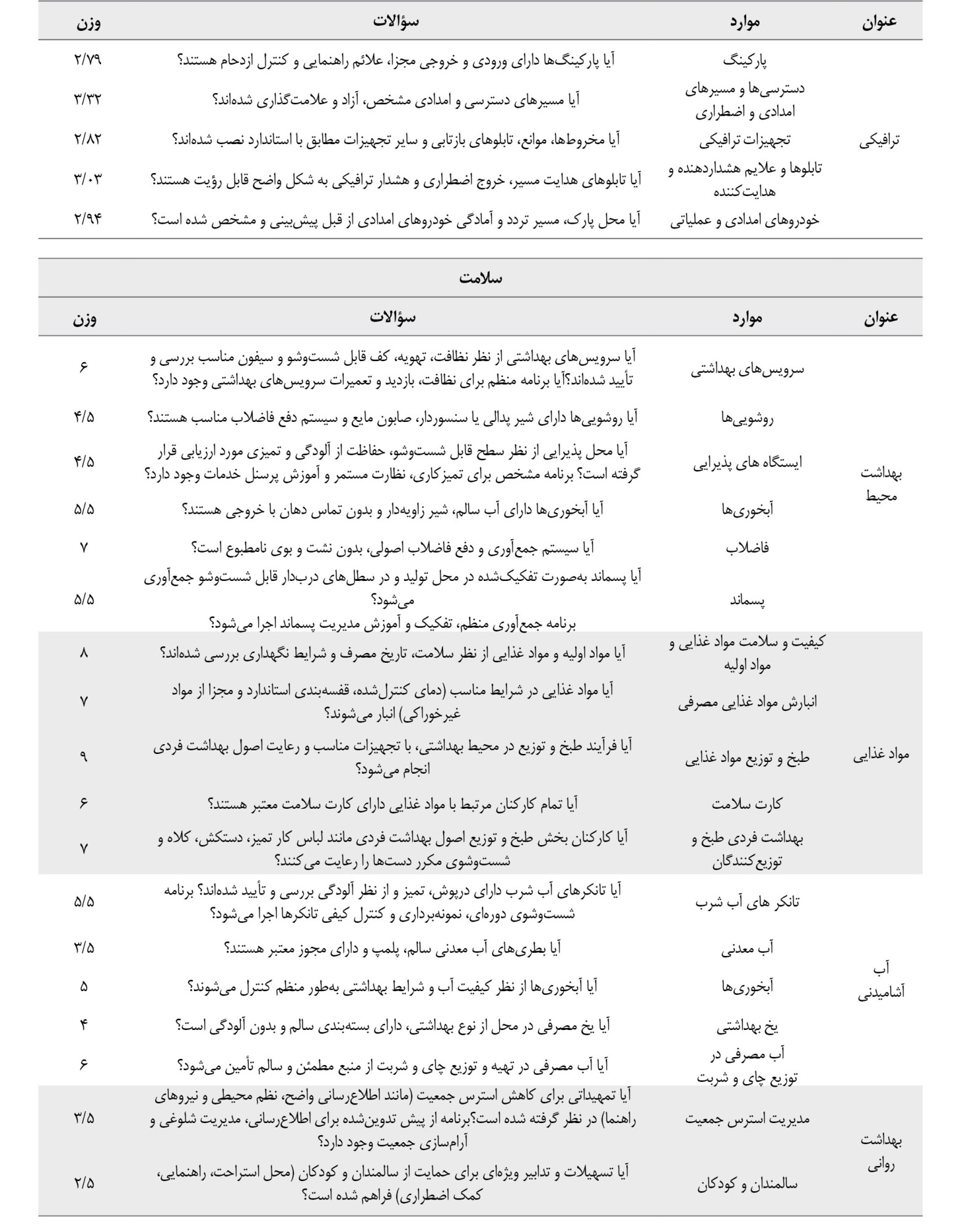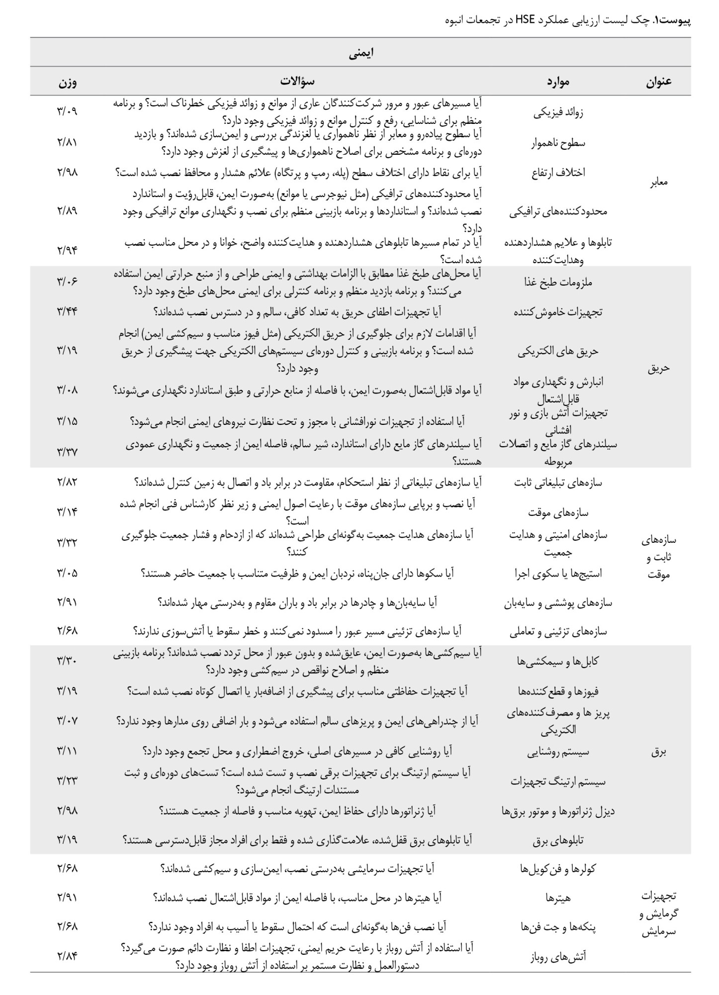 ۱ = رعایت کامل الزامات، 0/5= رعایت نسبی یا ناقص، 0 = عدم رعایت الزامات. امتیاز هر سؤال از رابطه فرمول شماره 1 محاسبه میشود: