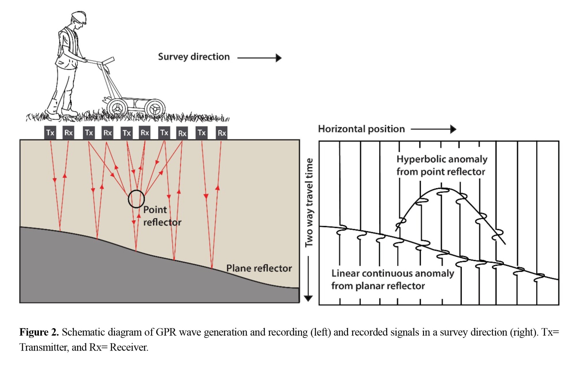 GPR is a real-time method that uses high-frequency radio waves to acquire data at very high velocity and resolution (Neal, 2004). Changes in the velocity of wave propagation due to differences in the electrical properties of materials will result in differences in the time it takes for the waves to travel and return. As the antennas move along the survey line, they collect a time series of received data at specific points along the line. These time series are then combined to create a subsurface scan view. Figure 2 shows a schematic diagram of the GPR wave propagation and recording. The data is recorded in specific formats. After going through various processing steps, this information is transformed into georadar sections that are used to identify various targets.