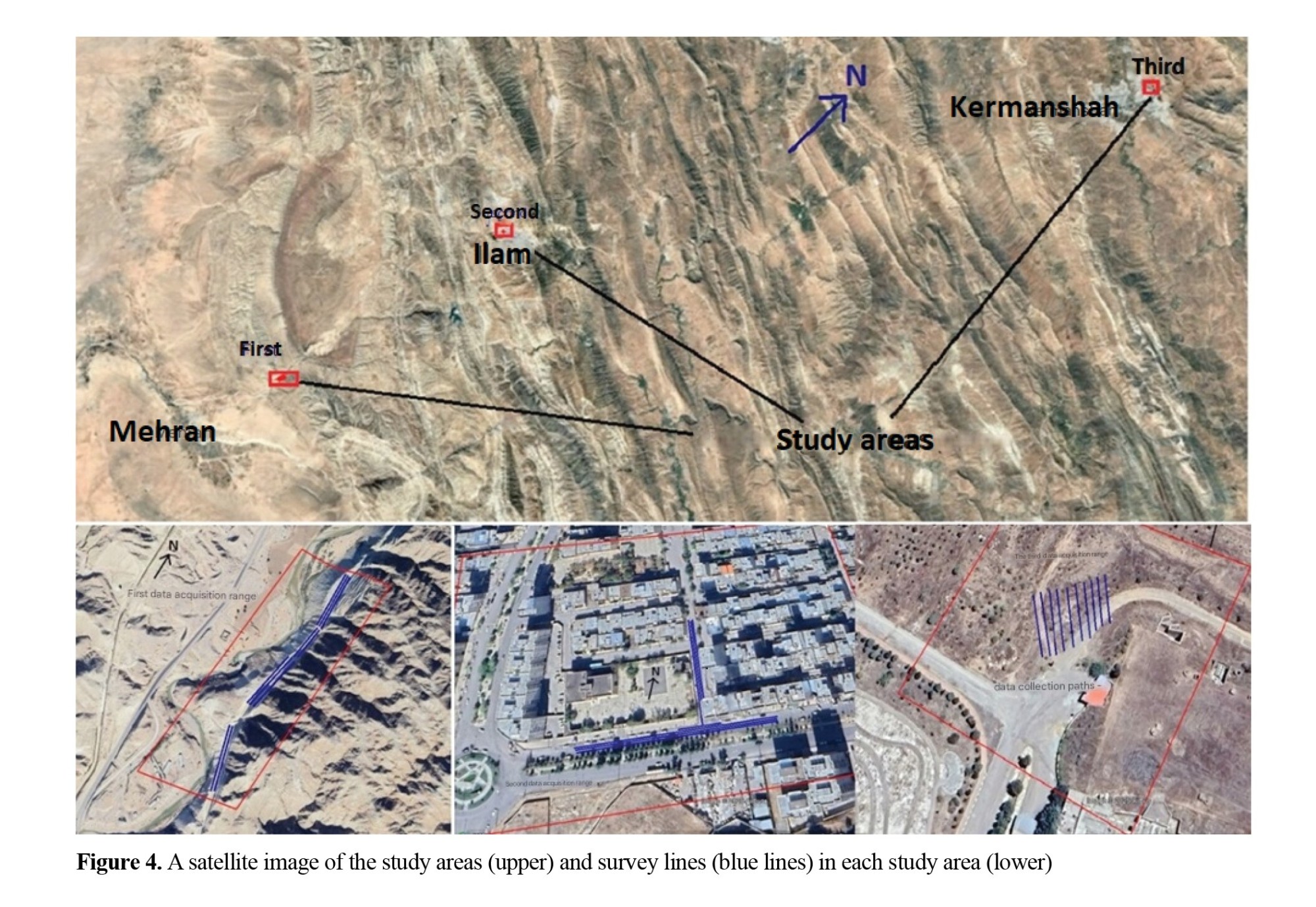 Data collection was carried out in three areas, including a road under construction (first area), an asphalt-covered street and road (second area), and the road on a small old tunnel (third area). Figure 4 shows a satellite image of the selected areas as well as a view of the profiles taken in these areas. These areas were selected in such a way that the cavities and fractures in them were visible or obvious. Geologically, these areas contain Holocene sediments. Two areas were in Ilam Province and one area on the outskirts of Kermanshah City, all of which were located in the Zagros geological zone. The road under construction was in the Gachsaran Formation. One of the characteristics of this Formation is its high susceptibility to erosion, especially erosion caused by water.