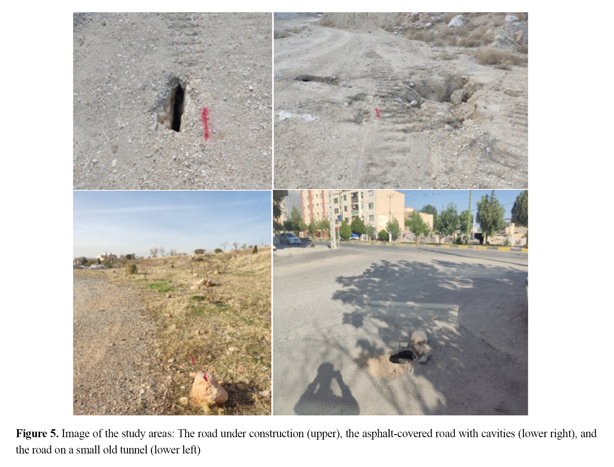 This formation consists of more than 500 meters of alternating red to blue-gray gypsum and marl, interbedded with cream-colored marly limestone. In fact, the dissolution rate of these materials is much higher than other rocks. Accordingly, karsts, cavities, frequent fractures, foliation, and spongy conditions in areas close to the surface are observed in this formation. Figure 5 shows the study area and the cavities and fractures on the surfaces.
