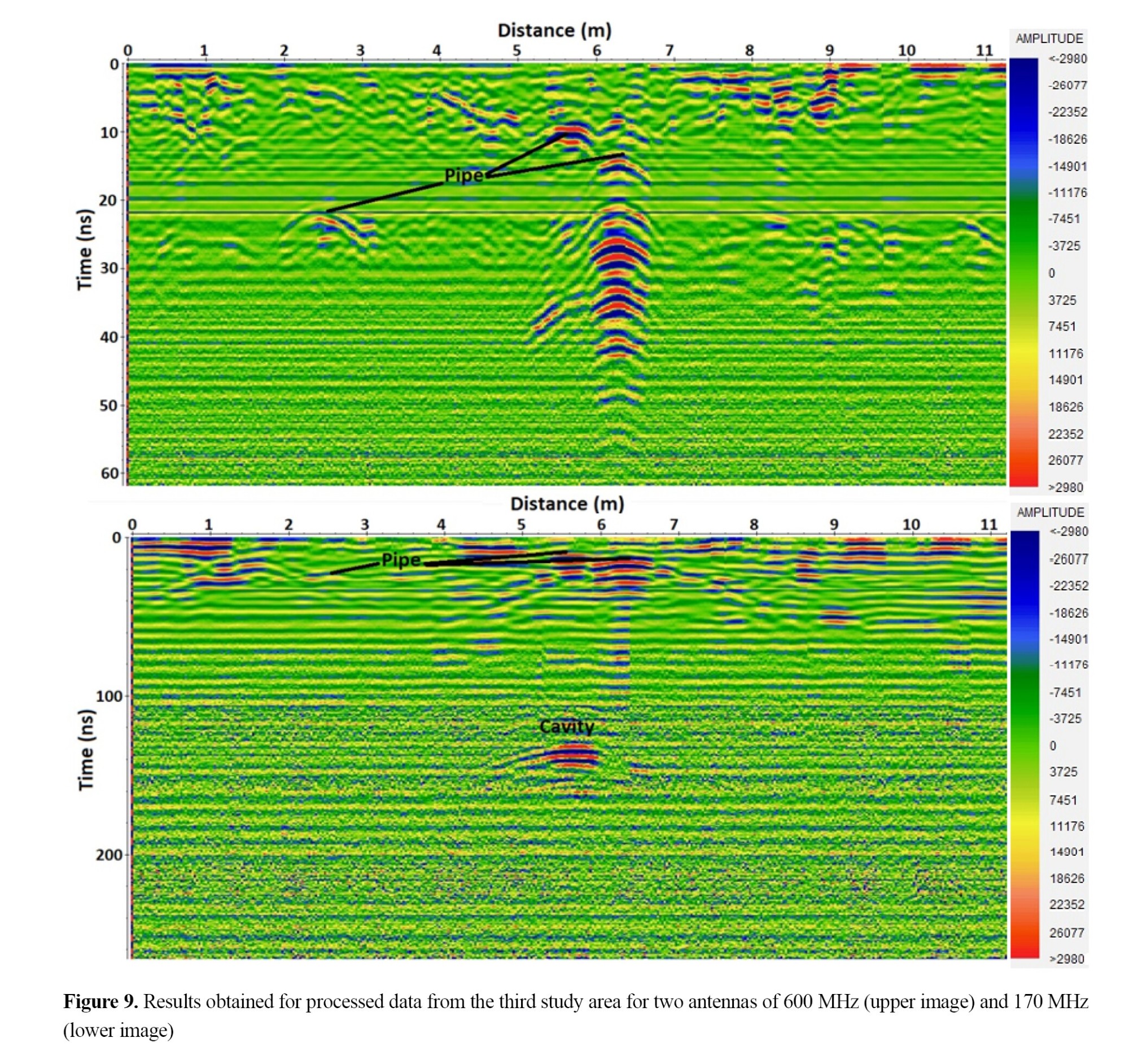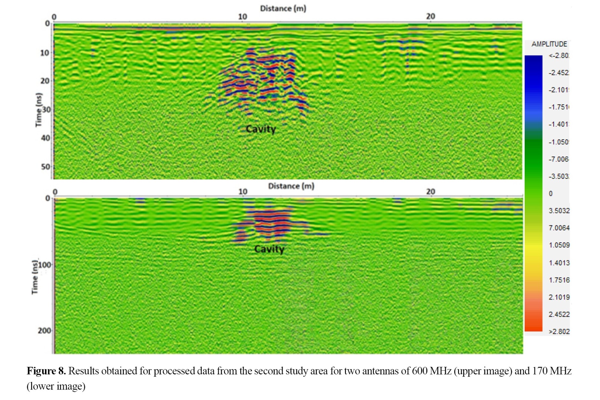 Figure 8 shows the results after data processing for the second area, which was an asphalt-paved street with subsurface cavities. By using both the 600 and 170 MHz antennas, the presence of a cavity in the area was evident. It should be noted that the data in this area were collected in different parallel lines with a distance of one meter from each other, and the best profile for detecting the cavities was selected and presented. The void identified in these data is close to the surface and is in complete agreement with field observations. The cavities along the profile line were about 3 meters in length and about 1 meter in height.