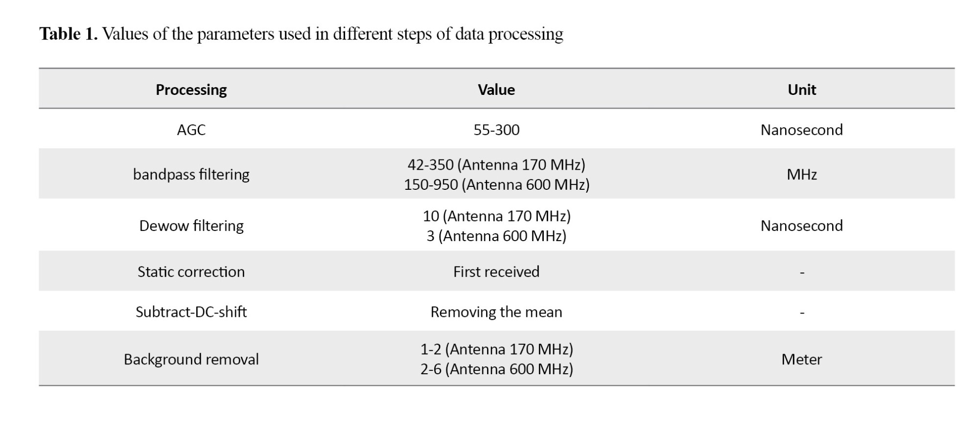 In this study, data acquisition was performed with two antennas with center frequencies of 170 and 600 MHz and a horizontal sampling distance of 4 cm. Reflexw and CrossPoint were used to process the data. The data processing steps included automatic gain control (AGC), bandpass filtering, Dewow filtering, static correction, subtract-DC-shift, and background removal. It should be noted that after data processing, only the results of the identified anomalies are presented. The values of the parameters used in different stages of data processing are presented in Table 1.