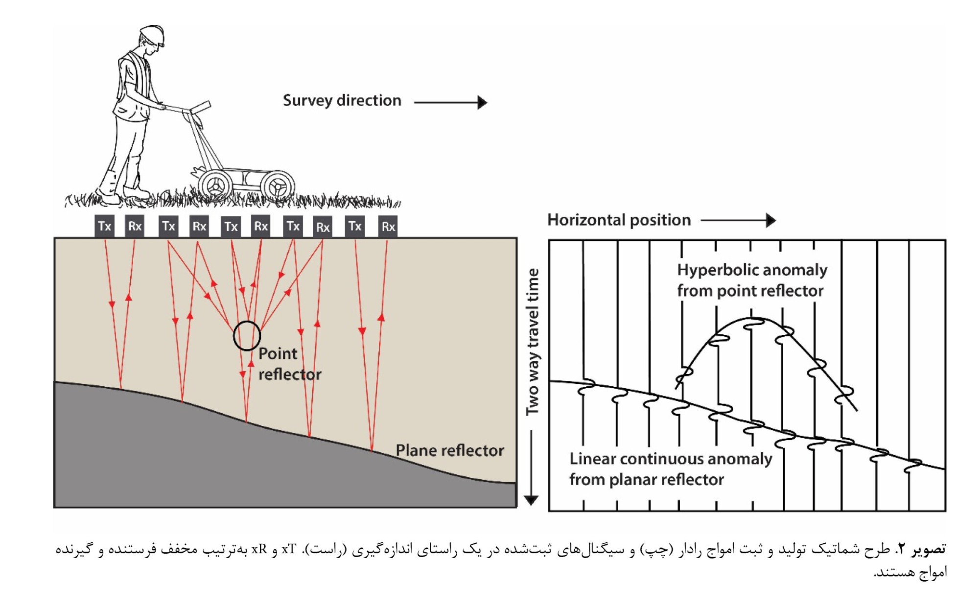 رادار نفوذی به زمین یک روش وابسته به زمان واقعی است که در آن از امواج رادیویی فرکانس بالا بهمنظور دادهبرداری با سرعت و وضوح بسیار بالا استفاده میشود (نیل، 2004). در این روش از امواج الکترومغناطیسی استفاده میشود که سرعت آن باتوجهبه ویژگیهای موادی که از آن عبور میکند، تعیین میشود. تغییر در سرعت عبور امواج بهدلیل تفاوت در خصوصیات الکتریکی مواد به اختلاف در زمان رفت و برگشت امواج منجر خواهد شد. چنانچه آنتنها در امتداد خط برداشت حرکت میکنند، یک سری از ردهای زمانی (یک سری زمانی از دادههای دریافتی) در نقاط خاصی از طول خط پروفیل، برداشت میکنند. سپس این سریهای زمانی در کنار هم قرار گرفته تا نمای اسکن زیرسطحی را ایجاد کنند. تصویر شماره 2 طرح شماتیکی از انتشار و ثبت امواج در روش ژئورادار است. دادههای ثبتشده با فرمتهای خاص ثبت میشوند. این اطلاعات پس از طی مراحل مختلف پردازشی به شکل مقاطع ژئوراداری در میآیند که برای شناسایی اهداف مختلف استفاده میشوند.