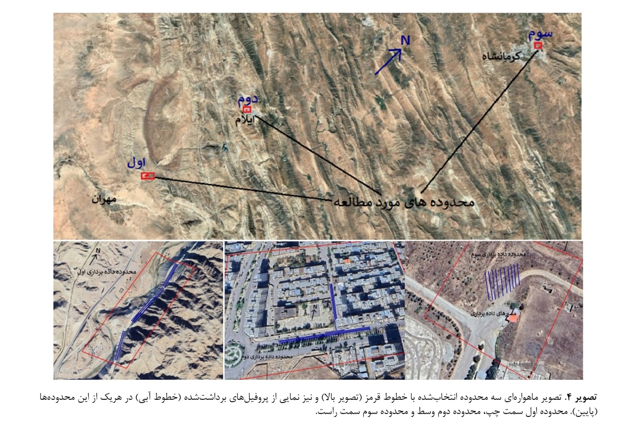 تصویر شماره 4، تصویر ماهوارهای محدودههای انتخابشده و نیز نمایی از پروفیلهای برداشتشده در این محدودهها را نشان میدهد. محدودهها بهگونهای انتخاب شدهاند تا وجود حفره و شکستگی در آنها مشهود و یا معلوم باشد. محدودههای موردمطالعه شامل دو محدوده در استان ایلام و یک محدوده در حاشیه شهر کرمانشاه و همگی در زون زمینشناسی زاگرس قرار دارند.