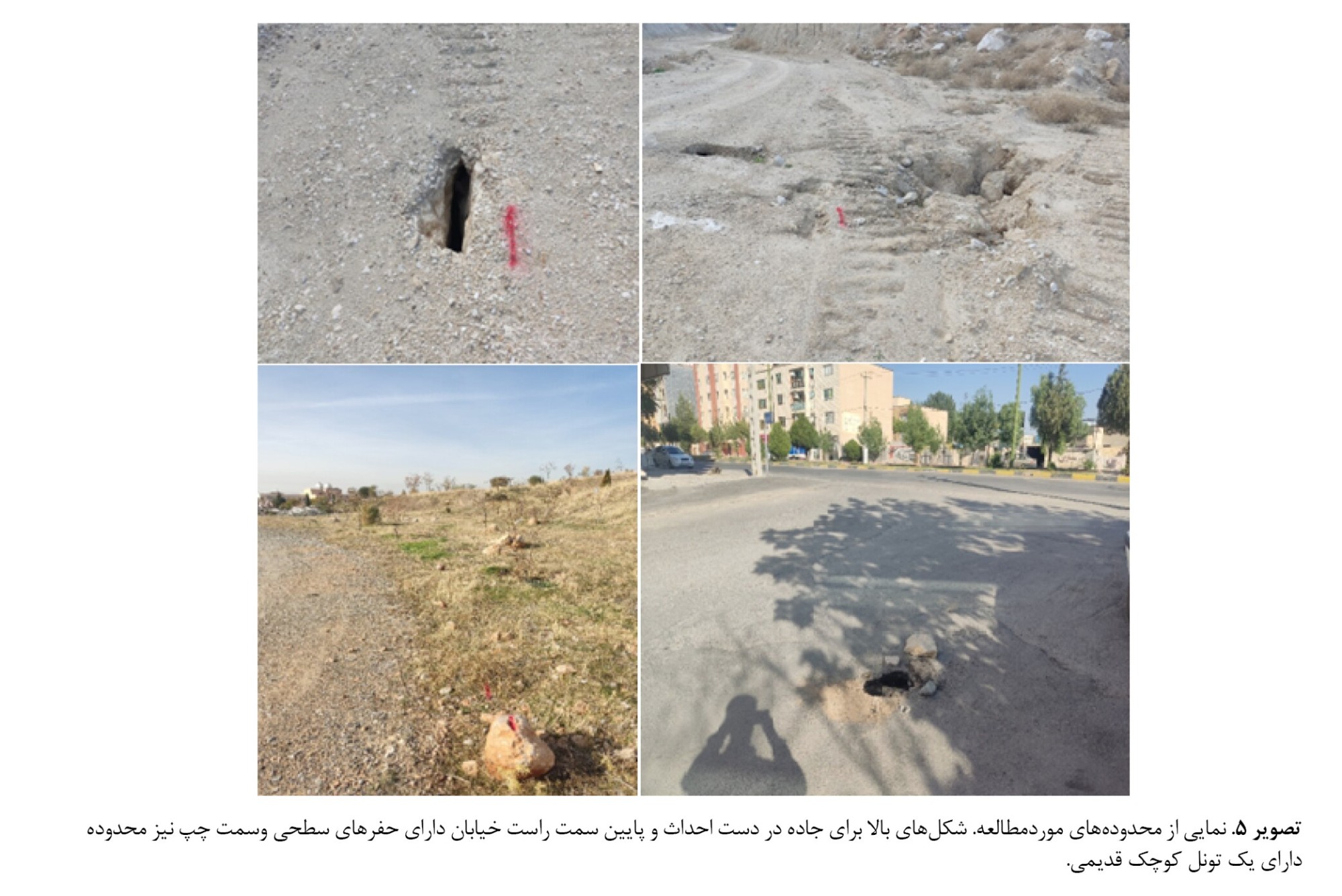 ابتدا در یک جاده در دست احداث و در سازند گچساران دادهبرداری انجام شد. این سازند از بیش از 500 متر، تناوب سنگ گچ و مارن قرمز تا آبی خاکستری و میان لایههای سنگ آهک مارنی کرم رنگ پدید آمده است. ازجمله ویژگیهای سازند گچساران باتوجهبه جنس مواد تشکیلدهنده آن که عمدتاً انیدرید و سنگ آهک میباشد، تأثیرپذیری زیاد آن از فرسایش بهخصوص فرسایش ناشی از آب است. درواقع درصد انحلال مواد متشکل این سازند بسیار بالاتر از دیگر سنگها میباشد. برایناساس میتوان شاهد مناطق کارستی، حفرات، خردشدگیهای مکرر، تورق و حالت اسفنجی در محدودههای نزدیک به سطح در این سازند بود. ازاینرو بهعنوان یکی از موارد مطالعاتی مورد بررسی قرار گرفت. همچنین دادهبرداری در یک خیابان دارای علائم فرونشت و یک محدوده که دارای یک تونل کوچک قدیمی است، انجام شد. از نظر زمینشناسی این محدودهها دارای رسوبات عهد حاضر میباشند. تصویر شماره 5 نمایی از محدوده موردمطالعه و رخنمون حفرات و شکستگیها در سطح را نشان میدهد. در محدودههای اشارهشده چندین برداشت در مسیرهای متفاوت انجام شد و نتایج پس از پردازش دادهها در هریک از این مناطق ارائه شده است. پس از پردازش دادهها، صرفاً نتایج آنومالیهای شناساییشده ارائه شده است.
