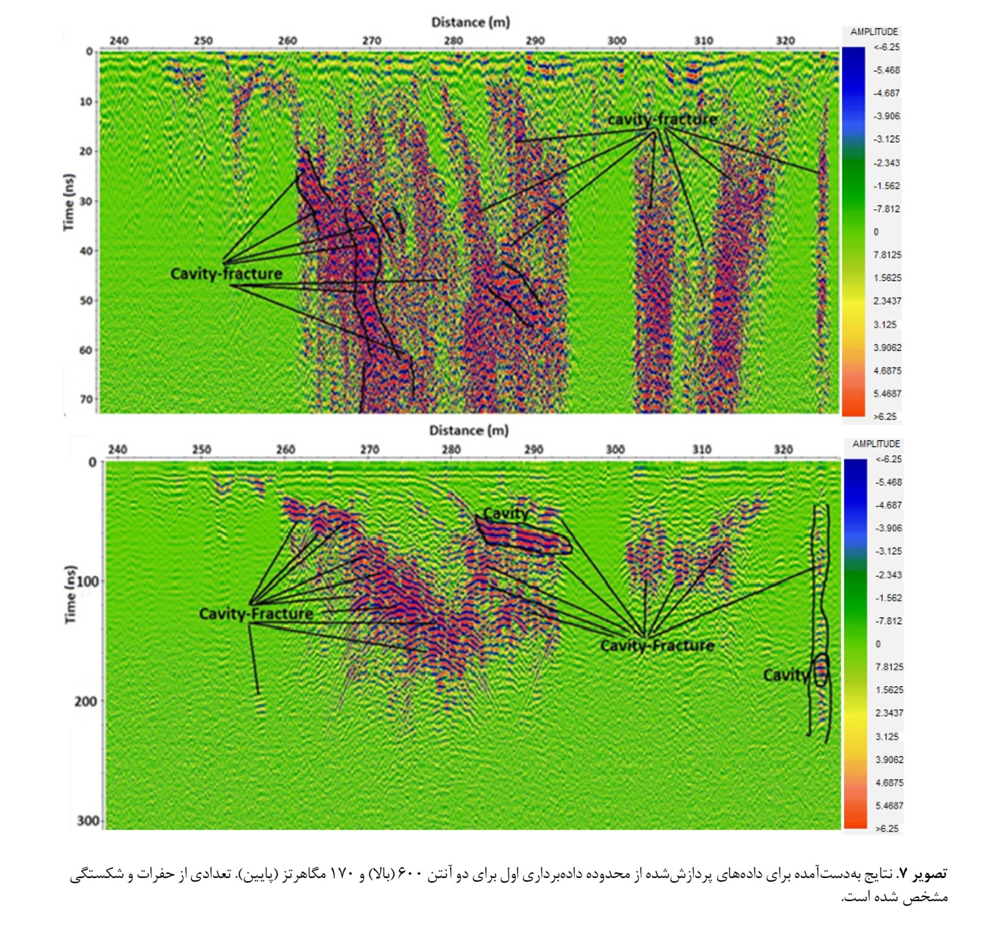 در ادامه برای هریک از محدودههای اشارهشده، نتیجه بهدستآمده ارائه شده است. پس از پردازش دادهها، با در نظر گرفتن ویژگیشناختی حفرات و شکستگیهای زیرسطحی در دادههای ژئورادار و نیز بررسی ضریب بازتاب و فاز امواج برگشتی از آنومالیهای مشاهدهشده در دادهها، تحلیل سرعت و نیز تحلیل طیف موجبری صورت گرفت و نتایج تفسیر شدند.