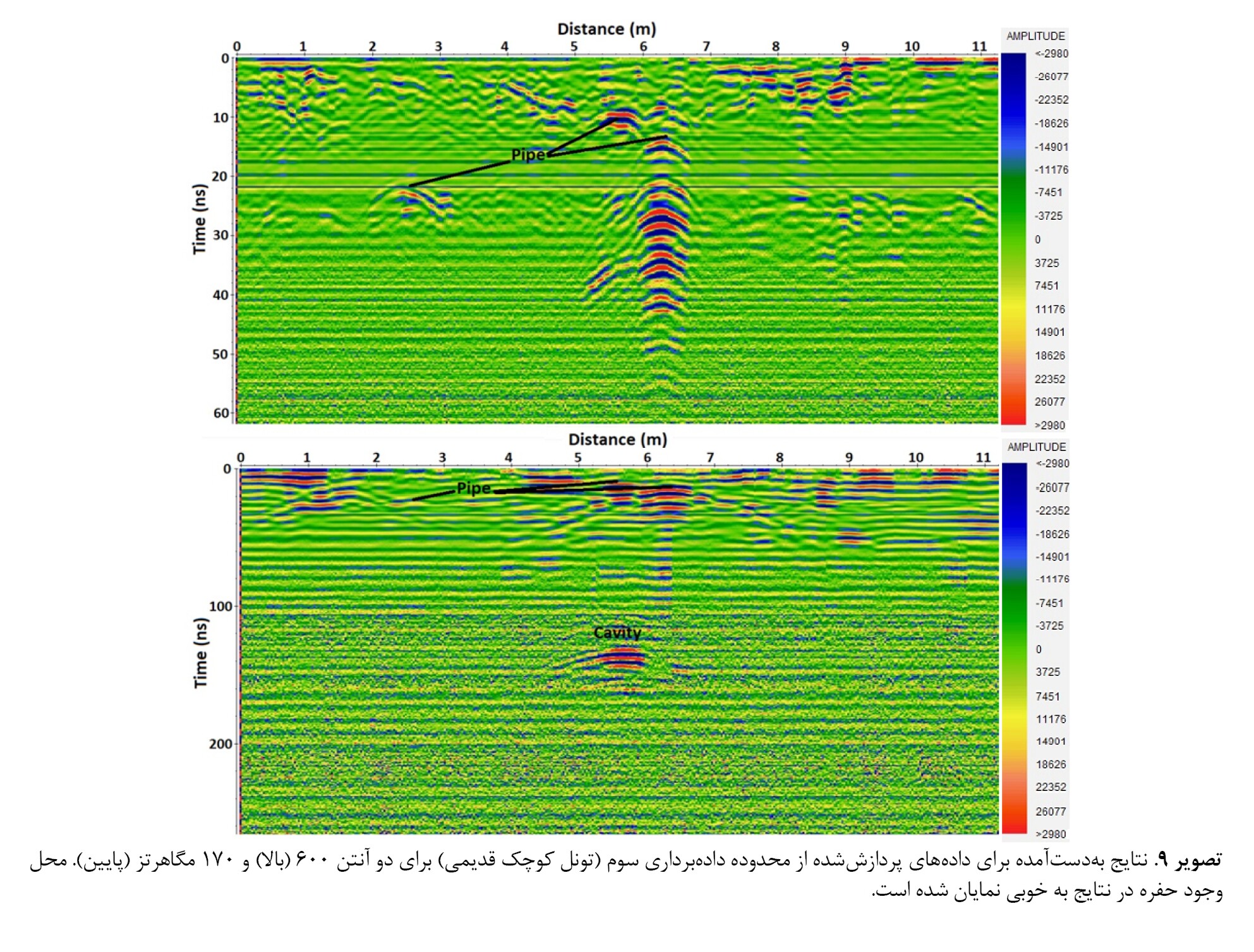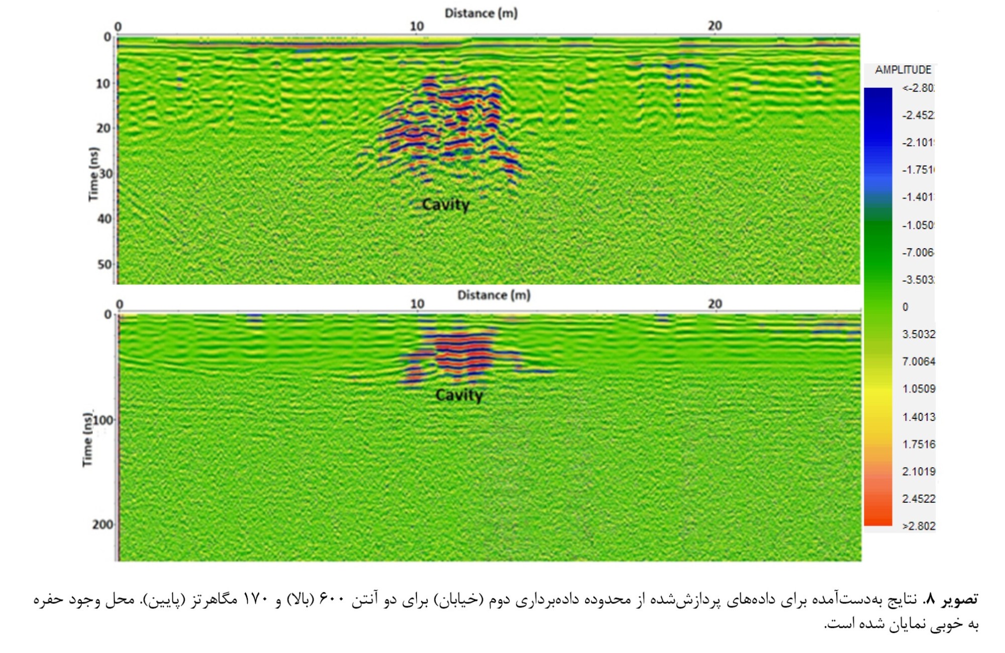 در تصویر شماره 8 نتایج بهدستآمده برای محدوده دوم که در واقع یک خیابان با روکش آسفالت و دارای رخنمون حفره زیرسطحی است، نشان داده شده است. براساس نتایج مربوط به هر دو آنتن 600 و 170 مگاهرتزی، وجود یک حفره در محدوده مشهود است. این نتایج پس از انجام پردازشهای ذکرشده و تحلیلهای تفاسیر مربوطه ارائه شدهاند. دادههای این بخش در پروفیلهای مختلف و موازی با فاصله عرضی 1 متر از هم برداشت شدهاند و بهترین پروفیل برای آشکارسازی حفره انتخاب و ارائه شده است. فضای خالی مشخصشده در این دادهها نزدیک به سطح بوده و با مشاهدات میدانی تطابق کامل دارد. ابعاد حفره از نظر طول در امتداد پروفیل حدود 3 متر و از نظر ارتفاع حدود 1 متر تخمین زده شده است.