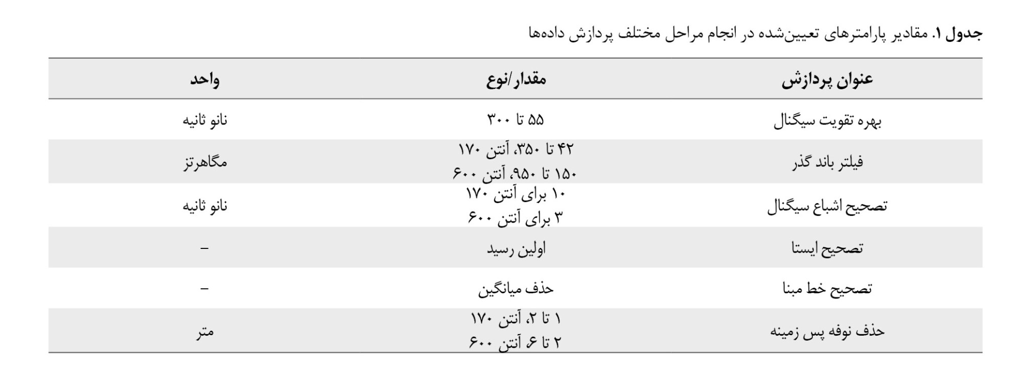 در این مطالعه دادهبرداری با دو آنتن دارای فرکانس مرکزی 170 و 600 مگاهرتز و با فاصله نمونهبرداری افقی 4 سانتیمتر انجام رسید. بهمنظور پردازش دادهها از نرمافزارهای تخصصی Reflexw و CrossPoint استفاده شده است. ازجمله مراحل پردازشی میتوان به اعمال بهره تقویت دامنه، فیلتر باند گذر، تصحیح اشباع سیگنال، تصحیح ایستا، تصحیح خط مبنا و حذف نوفه پس زمینه اشاره نمود. در ادامه مقادیر پارامترهای مورداستفاده در مراحل مختلف پردازش دادهها در قالب جدول شماره 1 ارائه شده است.