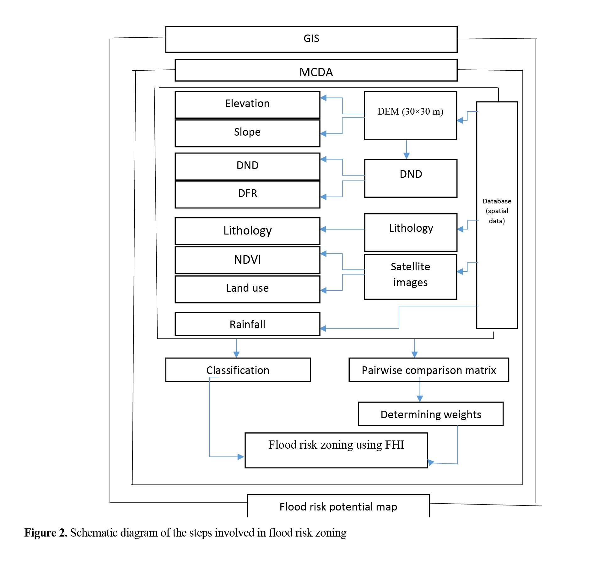 The FHI was used to identify areas vulnerable to flood risk. It is based on the MCDA of the AHP which considers eight hydrogeomorphic-climatic parameters including elevation, rainfall, slope, drainage network density (DND), distance from river (DFR), normalized difference vegetation index (NDVI), land use, and lithology (Abedini & Fathi, 2015). The selection of these factors was theoretically based on their relationship to flood risk. Each of the eight factors was classified based on the degree of impact on flood risk. The final flood risk map is prepared based on a combination of climatic and physical factors and elements (Esfandiari Darabad et al., 2021). Figure 2 presents a diagram of the steps involved in flood risk assessment.