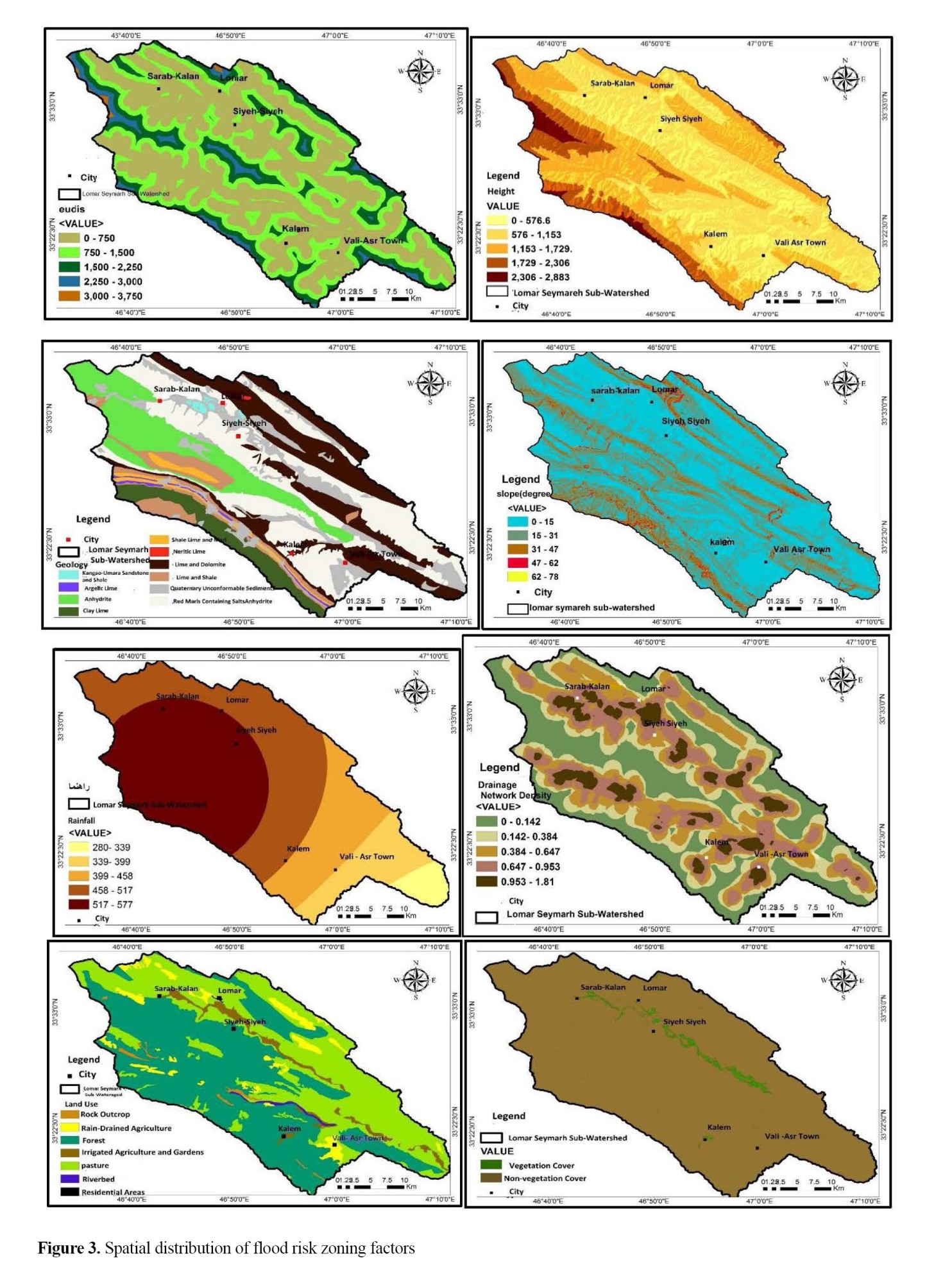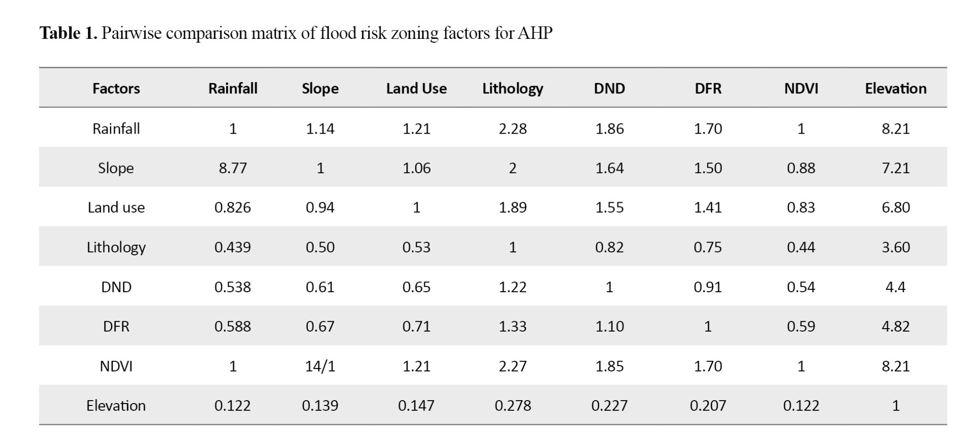 The applied matrix was 8x8 and the diagonal elements were equal to 1. The normalized weights for flood risk factors are presented in Table 2. Rainfall, vegetation, slope, and land use were identified as the most relevant factors in the FHI.