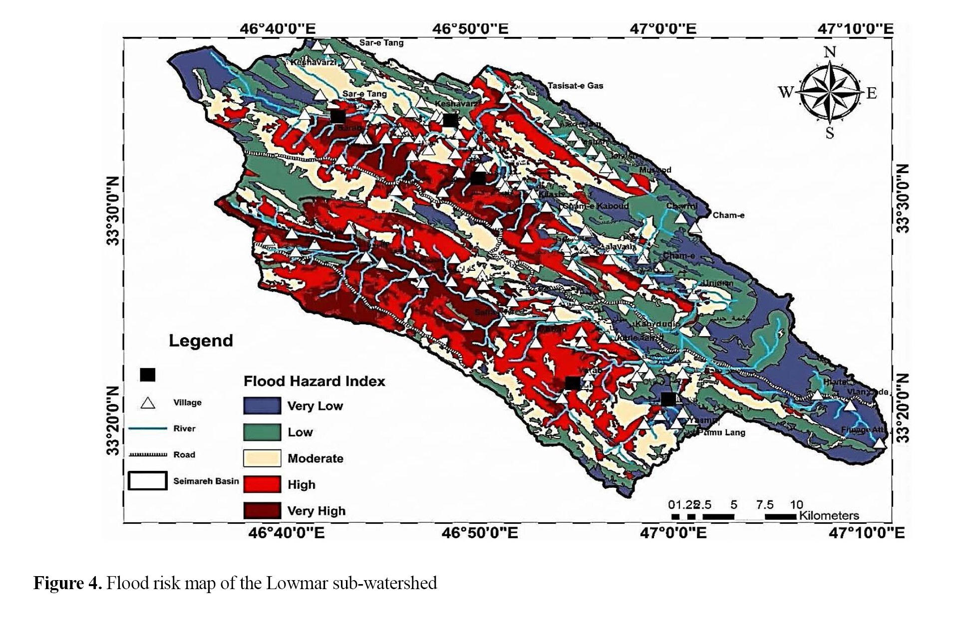 Figure 4 shows the flood risk map of the Lowmar sub-watershed.