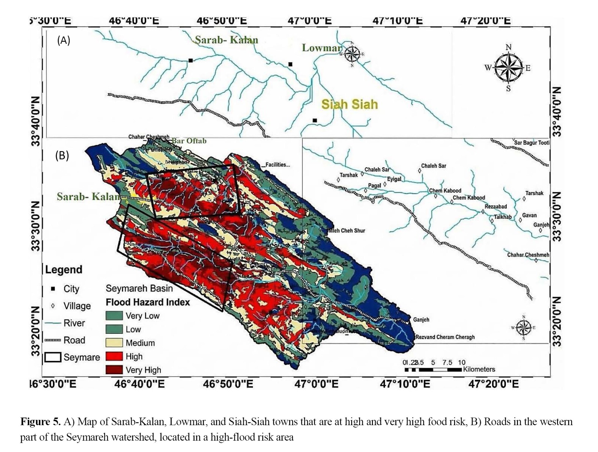 In the Seymareh watershed, 45 of 111 villages (40.5%) and 3 towns were located in areas at high and very high flood risk, and roads in the western part of the watershed were located in areas with high flood risk (Figure 5). The results of this study are consistent with the findings of Eguaroje et al. (2018), given that important factors (average slope, annual rainfall, vegetation, and land use) had the greatest impact on flood risk severity.