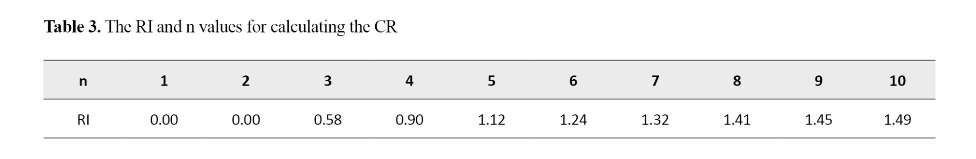 There are two main AHP consistency tests: Consistency index (CI) and consistency ratio (CR). The CI is obtained as: (λmax-n)/(n-1); the closer the λmax (maximum value of the comparison matrix) is to n, the better the consistency and the smaller the CI value. The CR is obtained as CI/RI, where RI is the consistency index of a random matrix that randomly generates a cross-correlation matrix and is dependent on the order. When the order of n is larger, the value increases. When the CR value is ≤0.1, the consistency of the matrix is acceptable (Chen, 2020). Table 3 provides the RI and n values used to calculate the CR. For eight factors, the λmax was 8.897 and RI was 1.41. The CR was obtained as 0.09, which is less than 0.1; therefore, the consistency of the matrix was acceptable. The FHI was then calculated as Equation 1 :