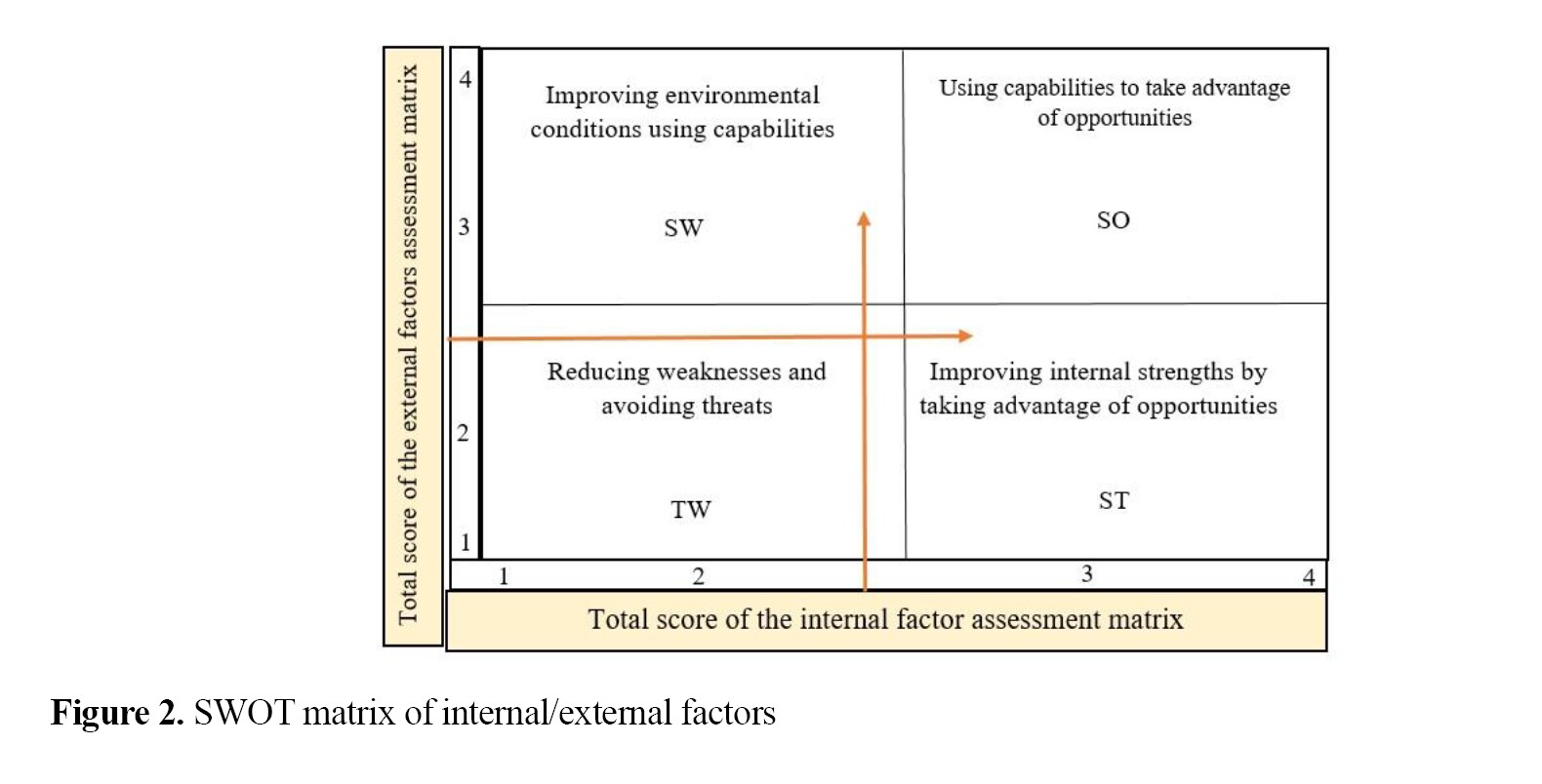 Based on the total weighted scores of internal and external factors, the status of the community-based risk management in Ardabil City was determined according to the four parts of the SWOT analysis.