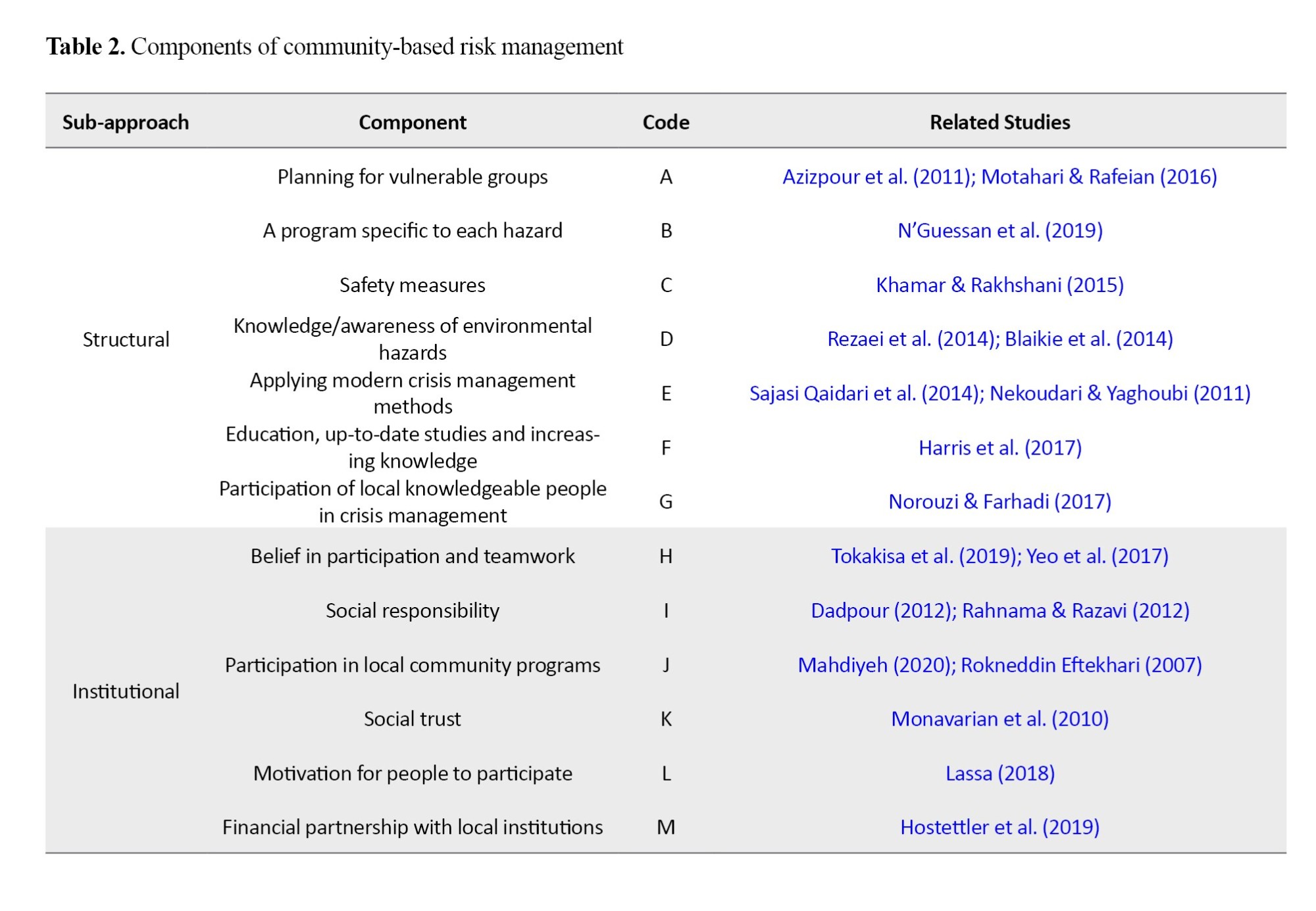 The review of international and national studies on community-based risk management showed that there are numerous studies in this field, but there is little research on providing risk strategies tailored to the conditions and situation of local communities. Table 2 shows the components of a community-based approach to risk management identified based on the review of the theoretical and practical background of the research topic.