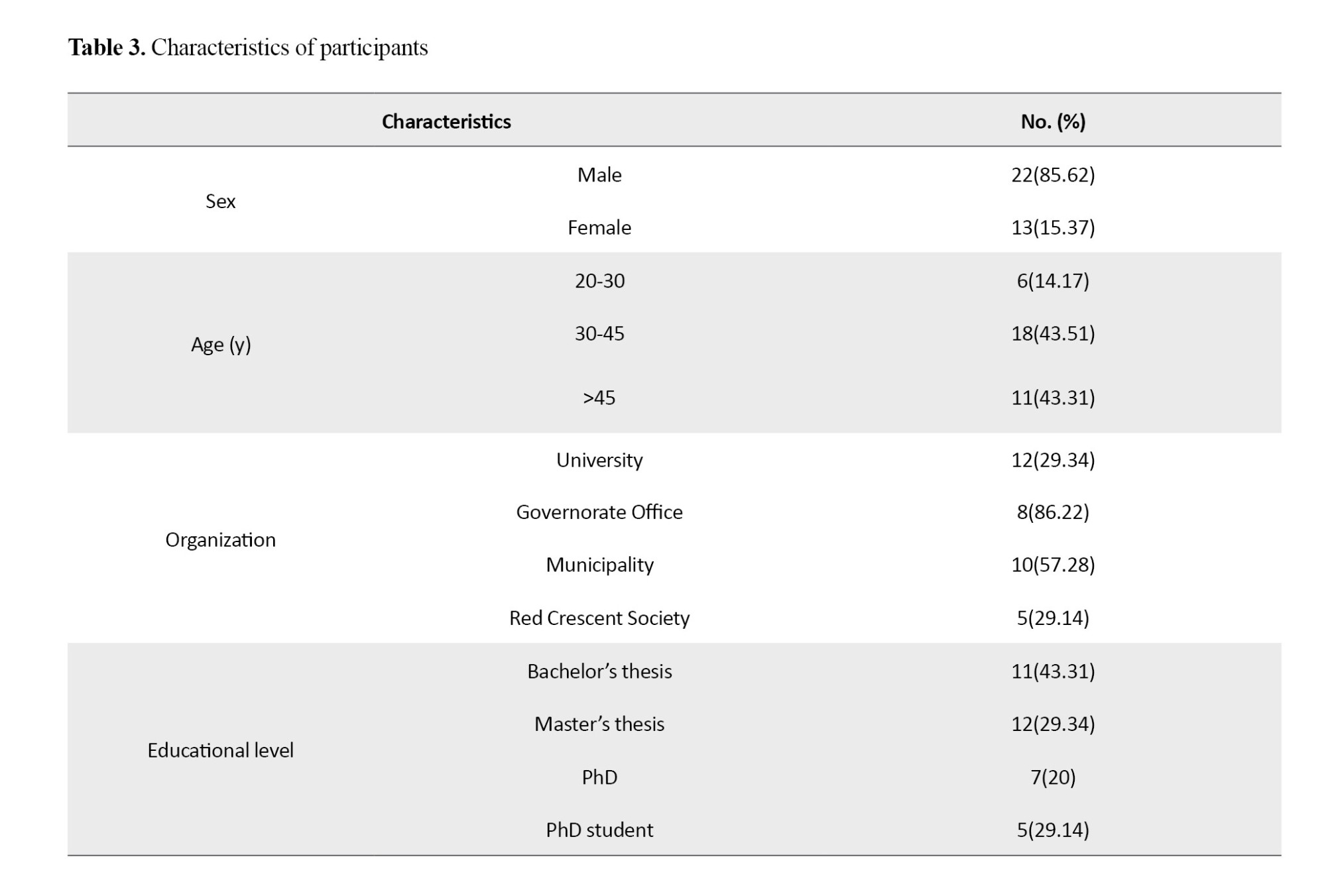 This is a survey and analytical study. The data were collected through library method and field visits. The library method was used to collect theoretical data and identify components (n=13) by reviewing documents and reports of community-based crisis management in organizations responsible for crisis management in Ardabil City. The field method was used to collect data by administering a questionnaire. The participants were 35 key informants, including experts, professors, and researchers in crisis management, selected via purposive sampling. Their characteristics are presented in Table 3.