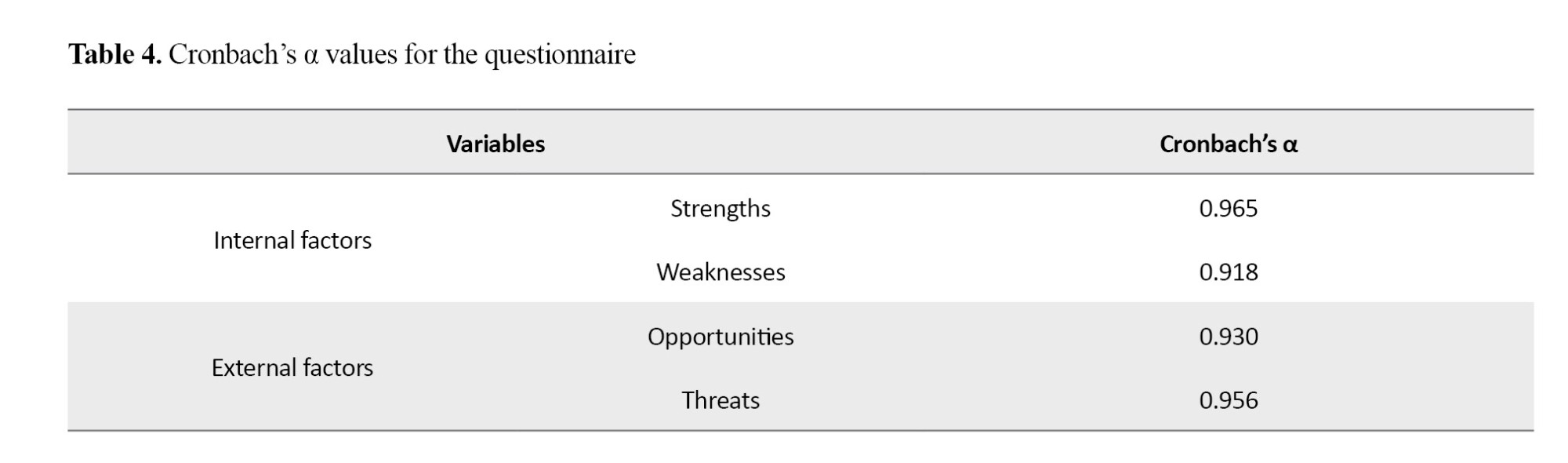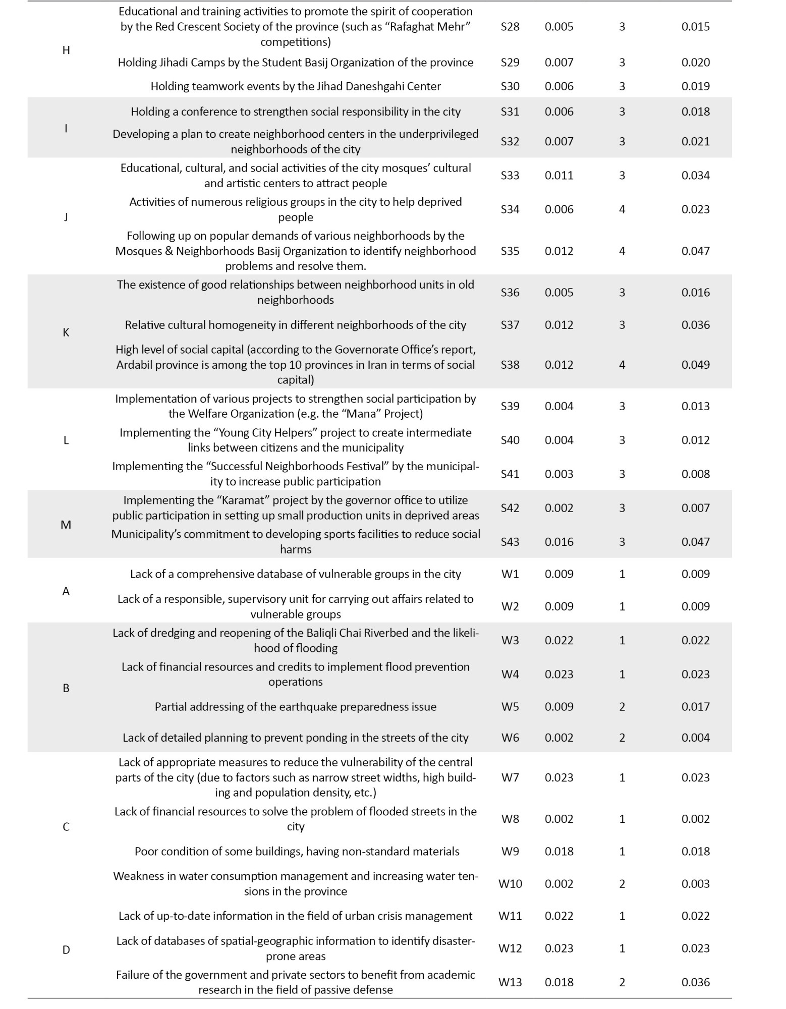 The SWOT method was used to analyze the data for providing strategies to strengthen the community-based approach to risk management in Ardabil City. For this purpose, first, through document review and environmental survey technique, an initial draft of internal factors (strengths and weaknesses) and external factors (opportunities and threats) was prepared and then screened using expert opinions. Then, internal and external factors were included in a questionnaire rated on a 5-point Likert scale. The questionnaire was validated by experts and had reliability assessed using Cronbach’s α (Table 4). A score of 3 was considered as the threshold for selecting the final variables; therefore, those with an average higher than 3 were selected as research variables. Finally, 43 variables were identified for strengths, 38 for weaknesses, 40 for opportunities, and 38 for threats. Next, these factors were evaluated by weighting and ranking them. In the next step, four separate strategies were presented for each component, based on expert opinions and the four domains of the SWOT method. Finally, to select the superior strategy from among the strategies presented for each component, the quantitative strategic planning matrix (QSPM) was used.