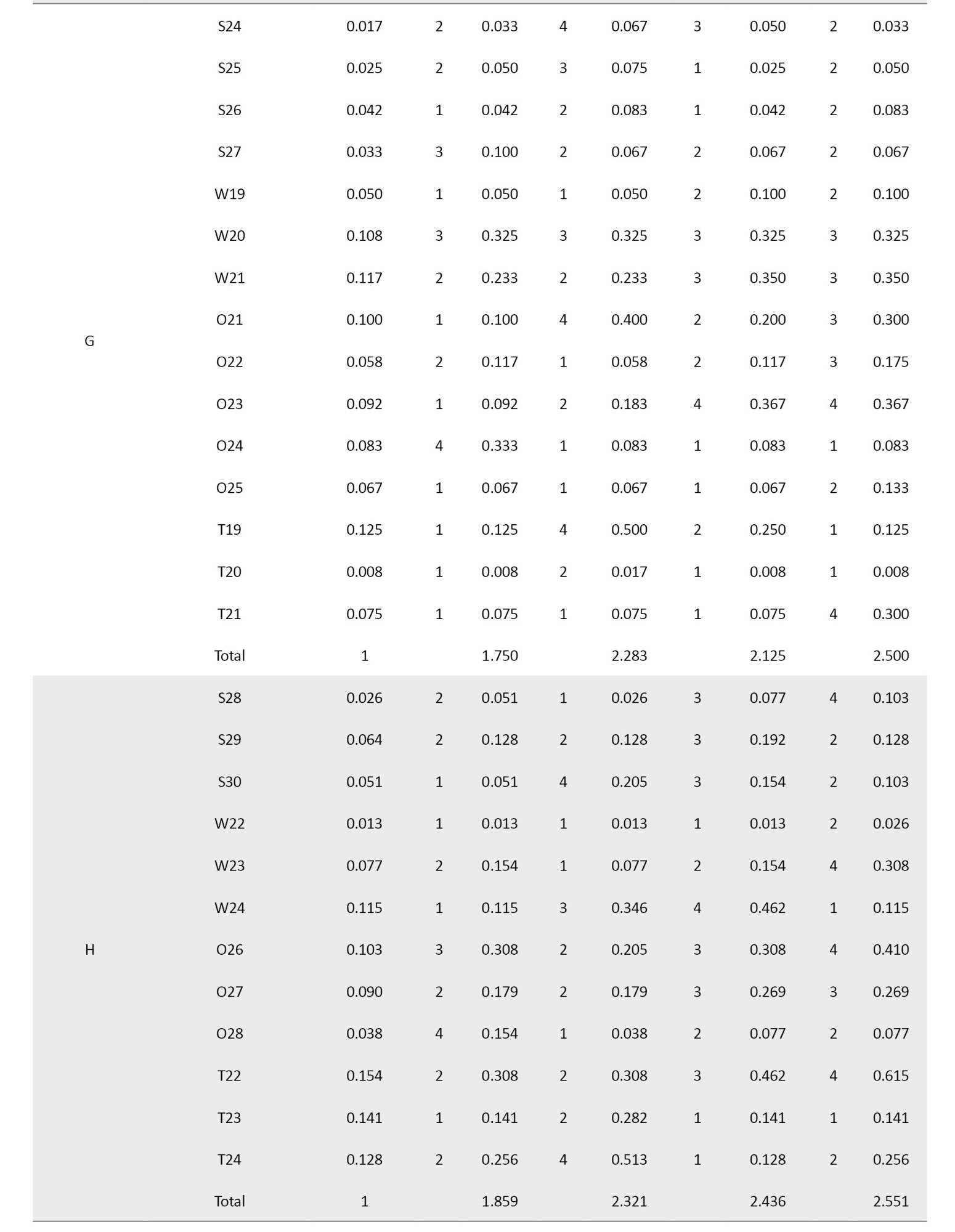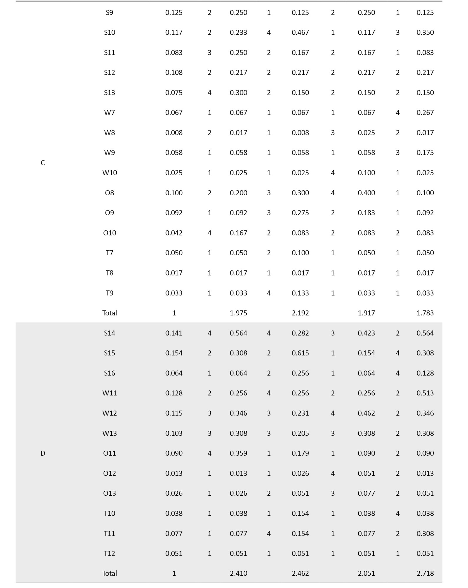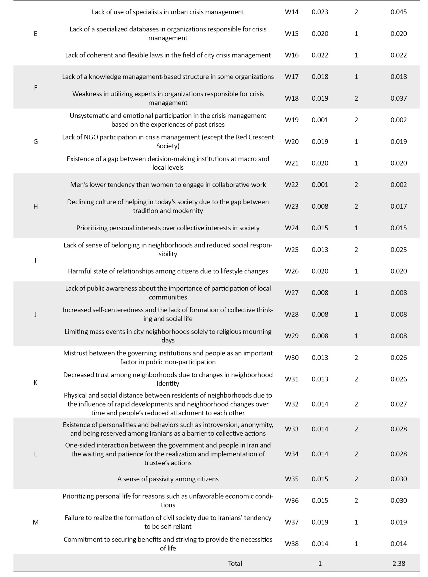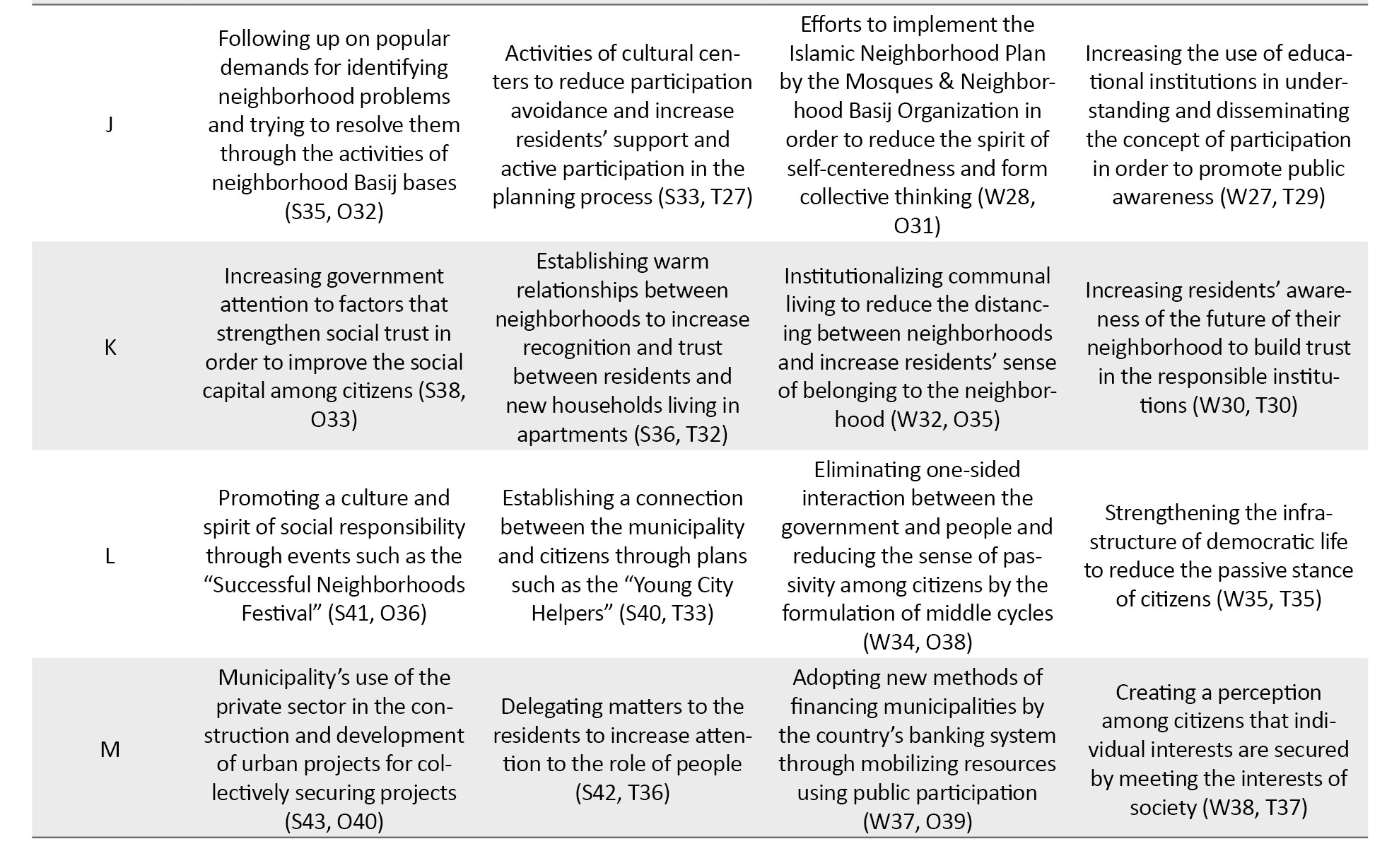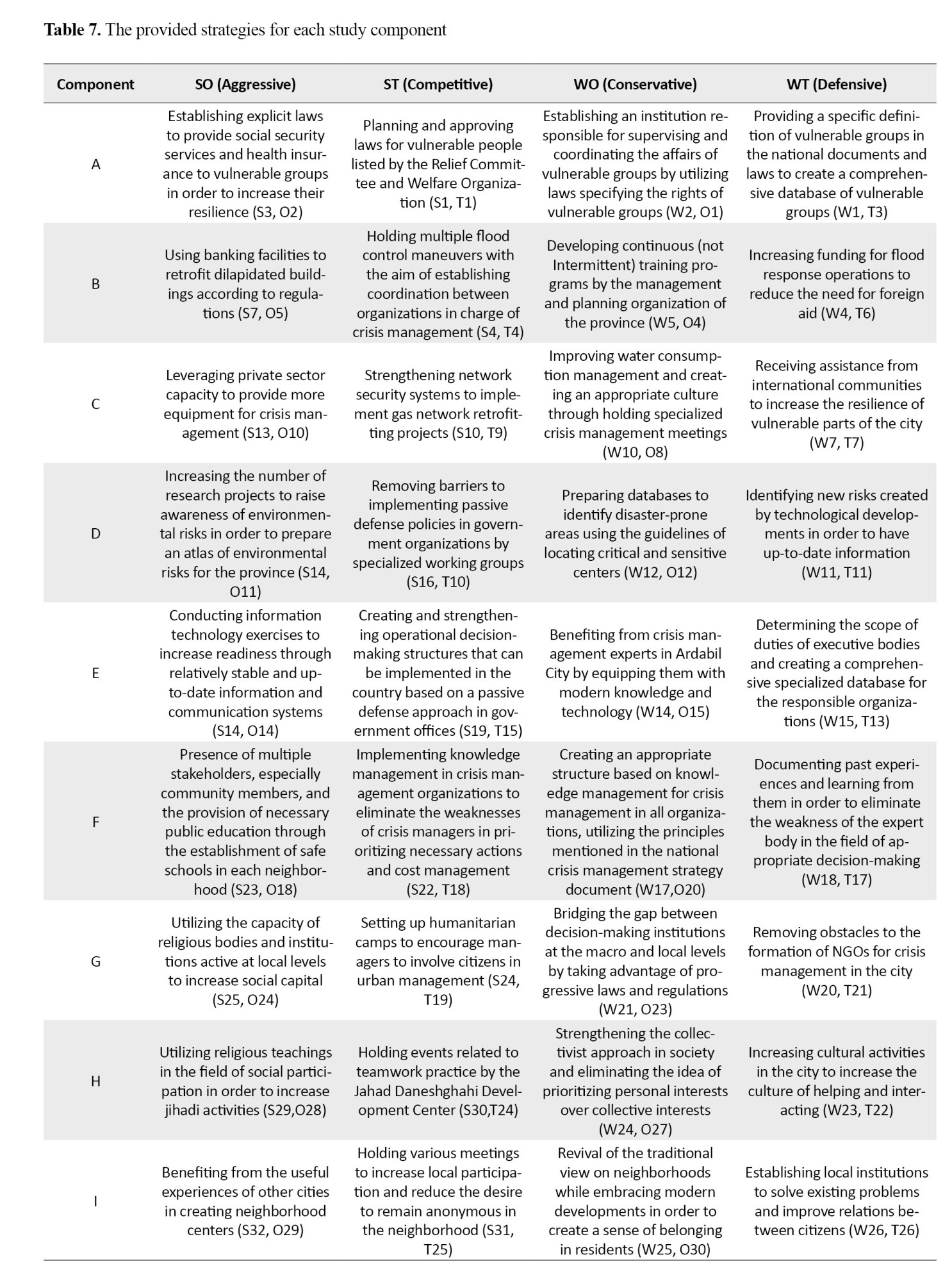 To select the best strategy from among the strategies presented for each component, the QSPM method was used. Each factor was assigned a number between 1 and 4, depending on its attractiveness. By multiplying each factor’s weighted score by its attractiveness score (AS), the total AS (TAS) of each factor was obtained. Finally, the strategy that achieved the highest TAS was selected as the superior strategy (Table 8). As can be seen, the best strategy for the component of “planning for vulnerable groups” was the SO strategy (TAS=3.255); for the component of “A program specific to each hazard”, the SO strategy (TAS=2.810); for the component of “Safety measures”, the ST strategy (TAS=2.192); for the component of “Knowledge/awareness of environmental hazards”, the WT strategy (TAS=2.718); for the component of “Applying modern crisis management methods”, the WO strategy (TAS=2.341); for the component of “Education, up-to-date studies and increasing knowledge”, the WO strategy (TAS=2.855); for the component of “Participation of local knowledgeable people in crisis management”, the WT strategy (TAS=2.500); for the component of “Belief in participation and teamwork”, the WT strategy (TAS=2.551); for the component of “Social responsibility”, the WO strategy (TAS=3.028); for the component of “Participation in local community programs, the WT strategy (TAS=2.197); for the component of “Social trust”, the WT strategy (TAS=2.487); for the component of “Motivation for people to participate”, the WT strategy (TAS=2.859); and for the component of “Financial partnership with local institutions”, the ST strategy (TAS=2.491).