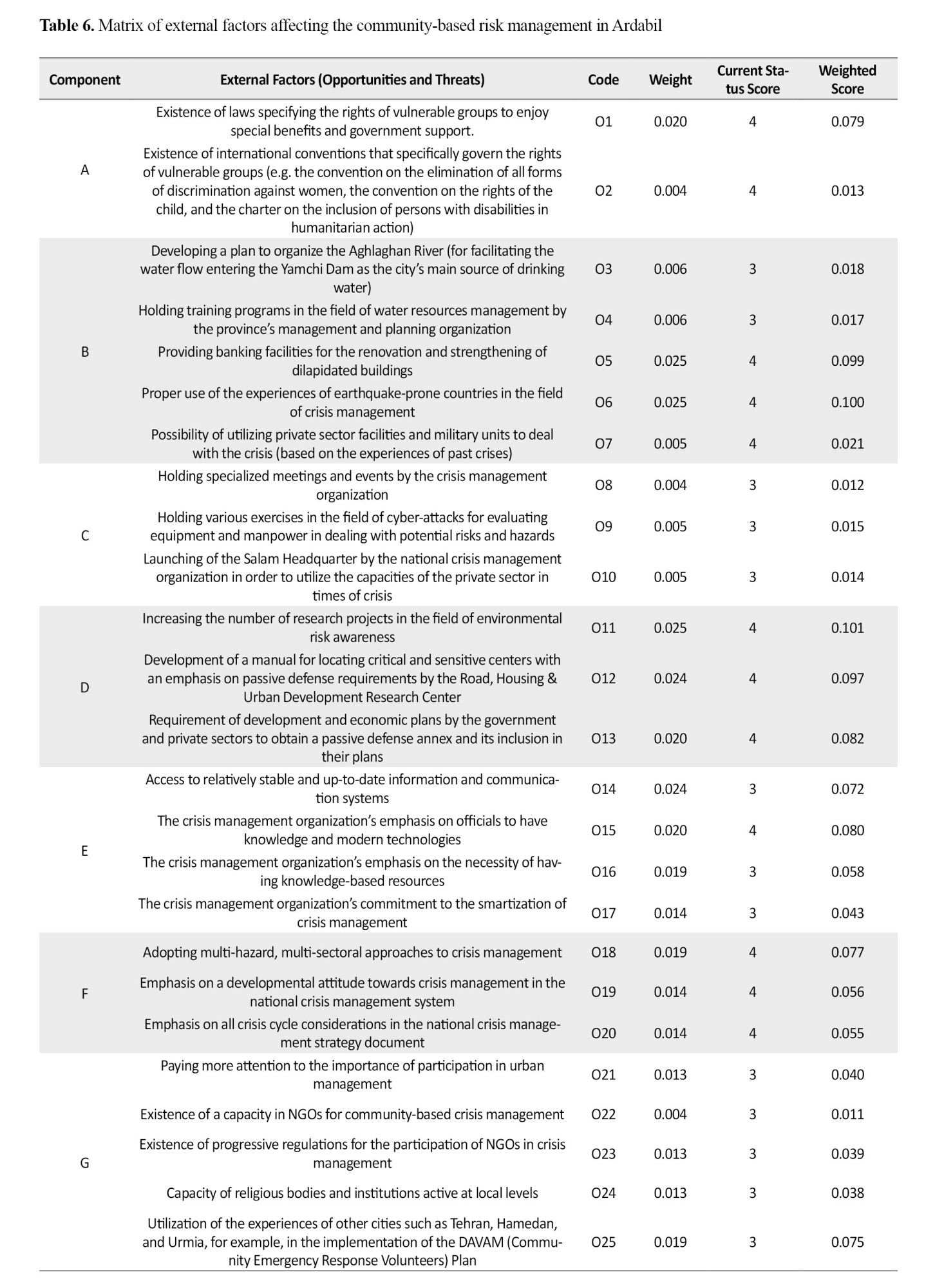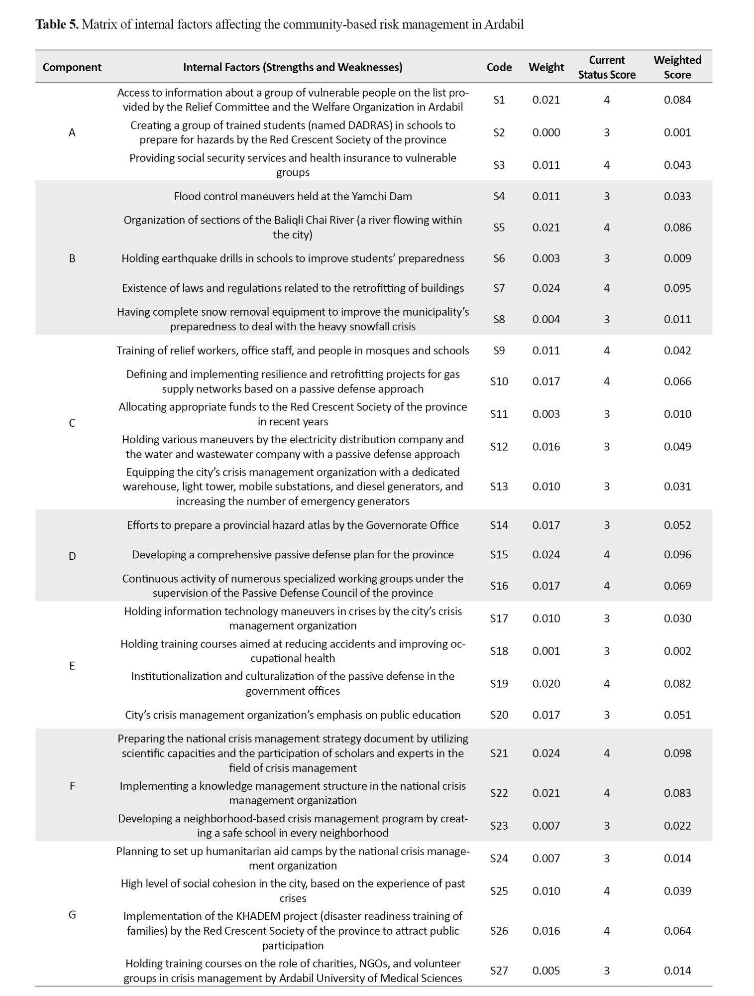 The SWOT matrix of internal/external factors affecting the community-based risk management in Ardabil